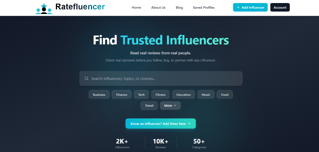 Ratefluencer is a platform designed to help brands and startups discover genuine influencers through real reviews, verified past performance, and authentic audience engagement. In an industry often driven by vanity metrics, fake followers, and inflated engagement, Ratefluencer brings transparency and trust by providing reliable insights into influencer effectiveness. It enables businesses to make smarter, data-driven marketing decisions, avoid wasting budget on ineffective collaborations, and build meaningful partnerships with creators who truly deliver measurable results and real impact.