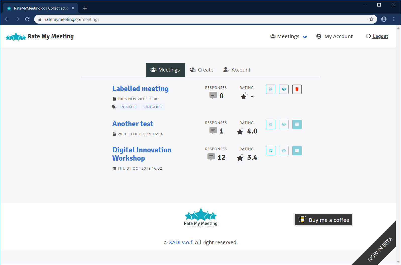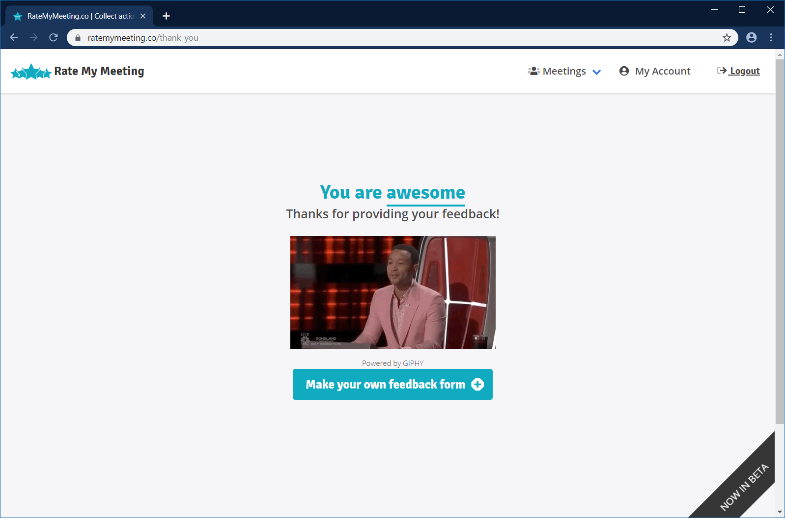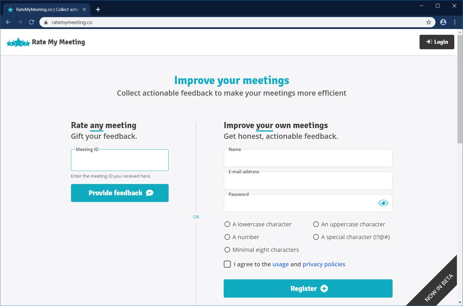 A start-up born out of frustration for inefficient meetings. Use RateMyMeeting to diagnose how your meetings are perceived. And then take action to improve. We're bootstrapped and free while in beta. Actively looking for feedback.