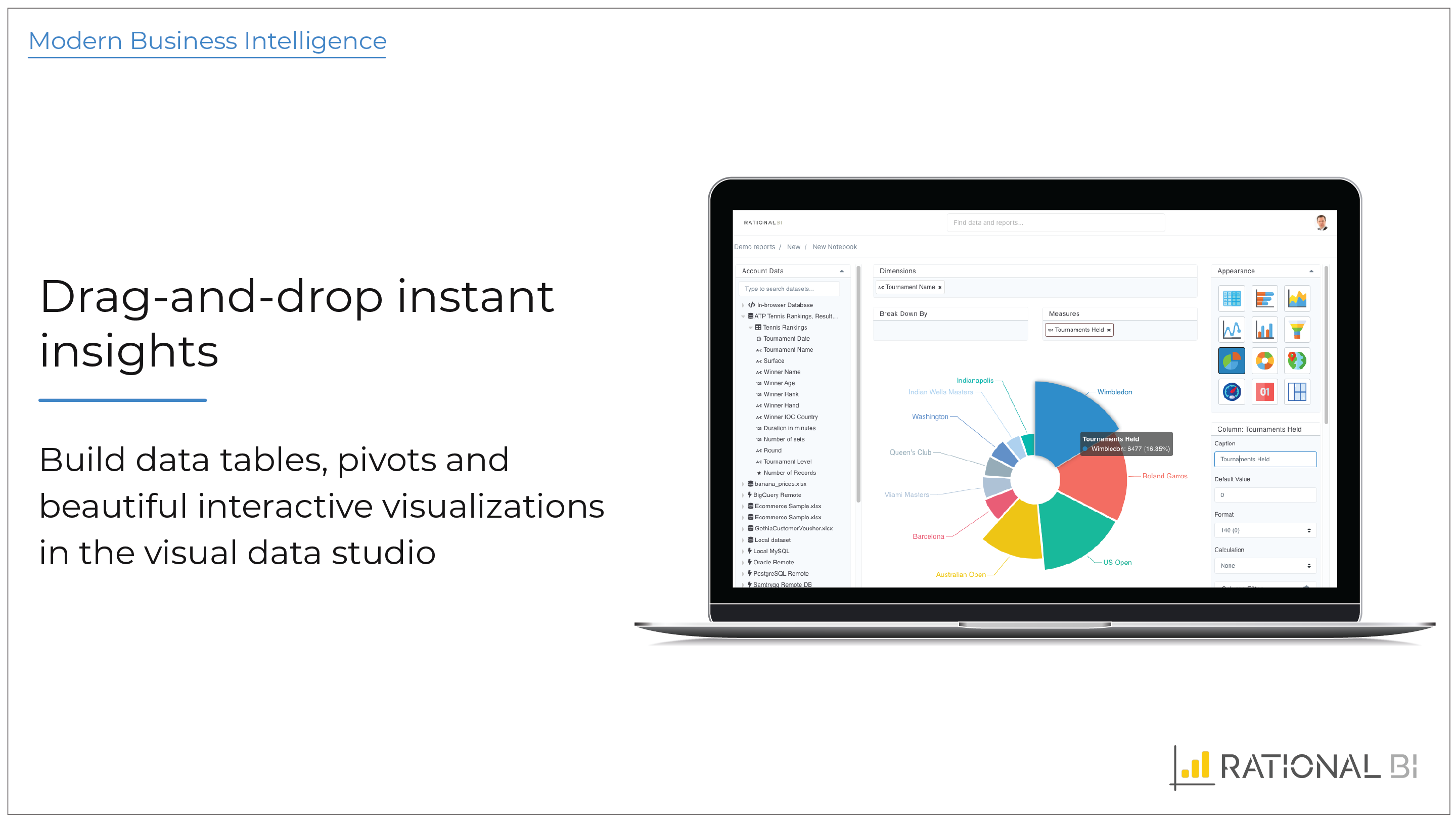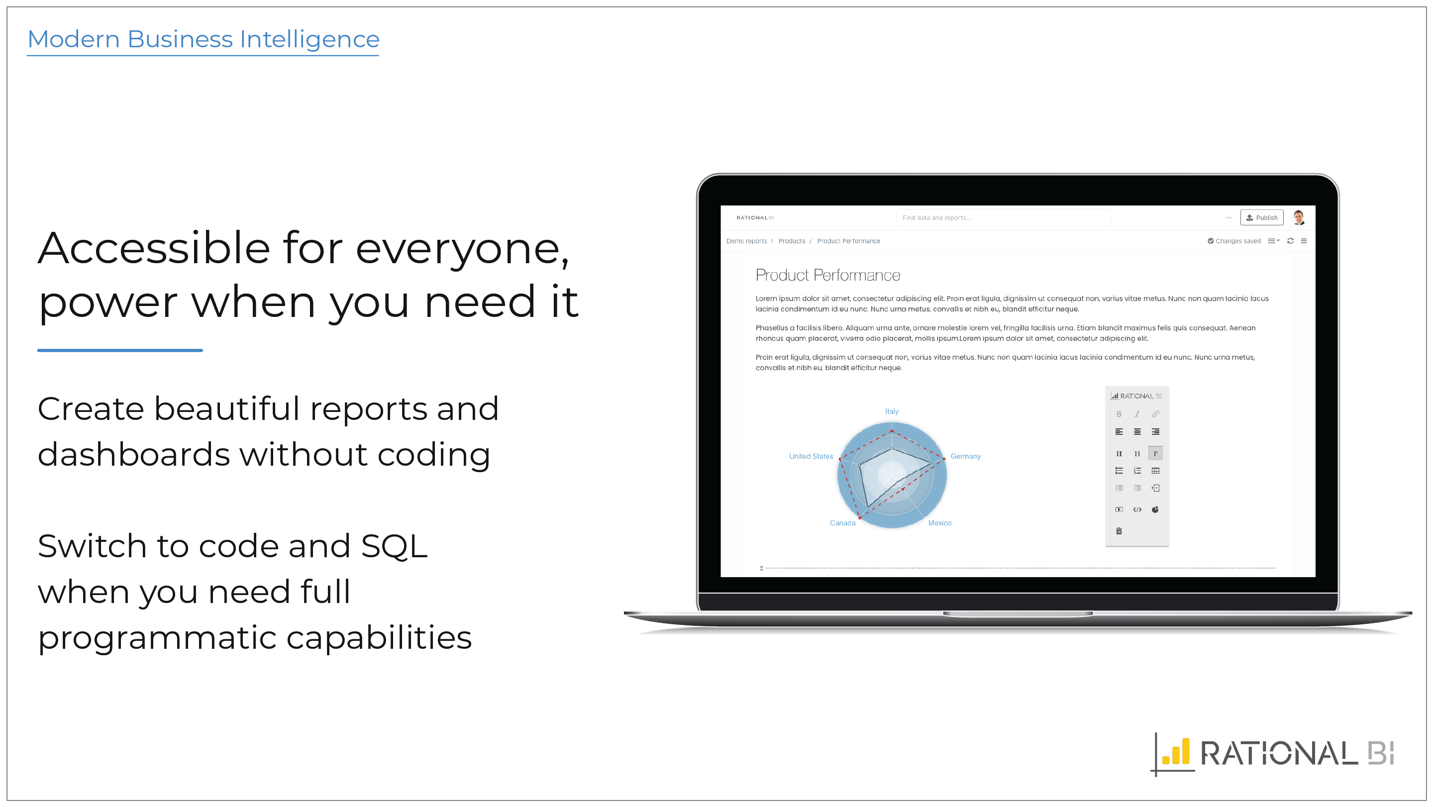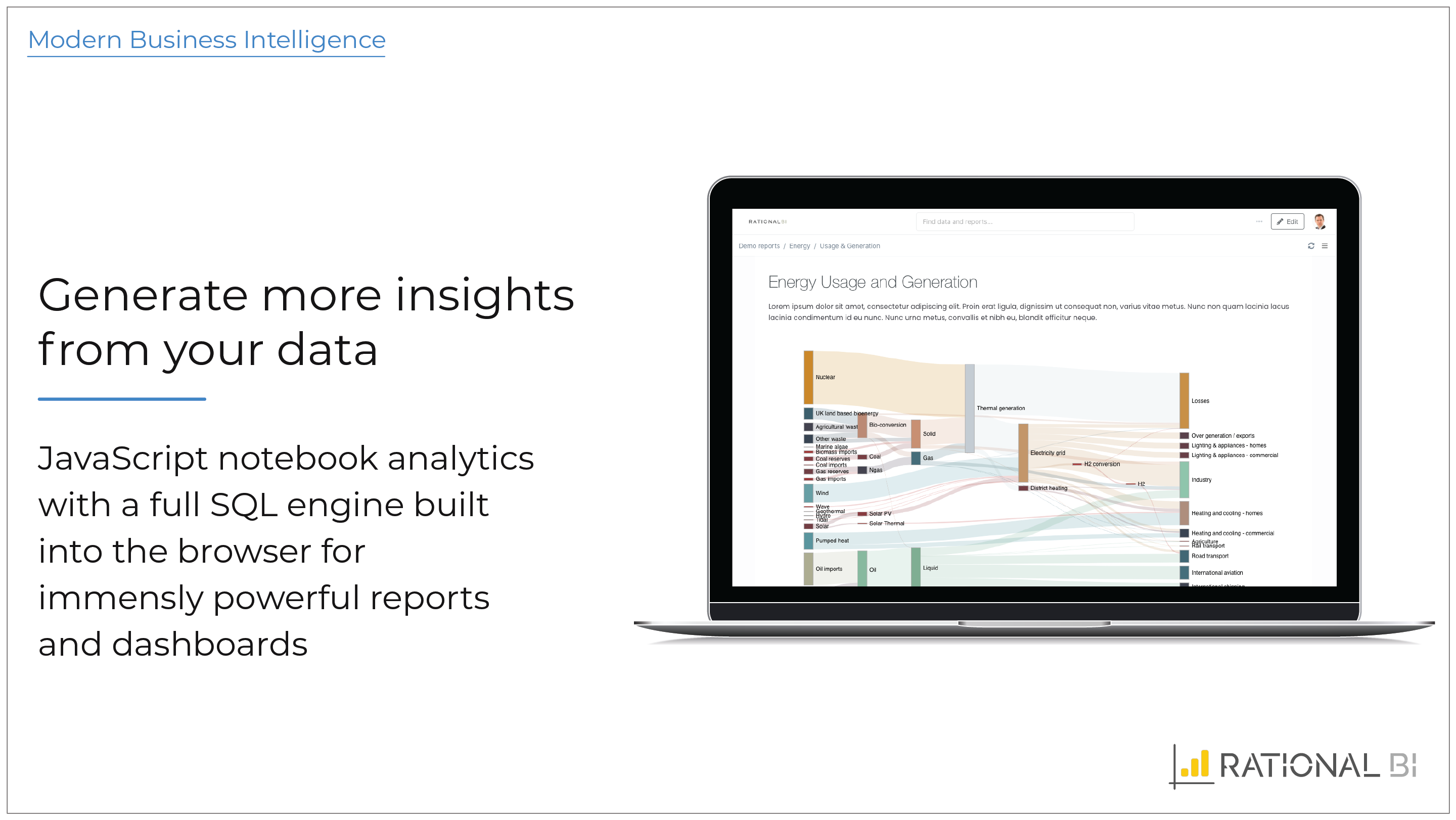 Rational BI provides effortless analytics, data science and business intelligence in a modern analytical platform that connects to all your databases, data files and cloud drives including your AWS and Azure data sources. Explore and visualize data in a lightning fast interface. Build real-time notebook-style reports directly in your web browser with JavaScript and SQL with direct and live connections to all your data. Filter and query data at light-speed with a full SQL database embedded in the client without network latencies. Schedule reports and notebooks for automatic delivery to everyone in your organization. Enterprise features like Single Sign-On and strict SLAs make Rational BI a perfect fit for organizations of all sizes. Rational BI delivers deep analytics, reporting, dashboards and a full Business Intelligence stack in a single modern platform.