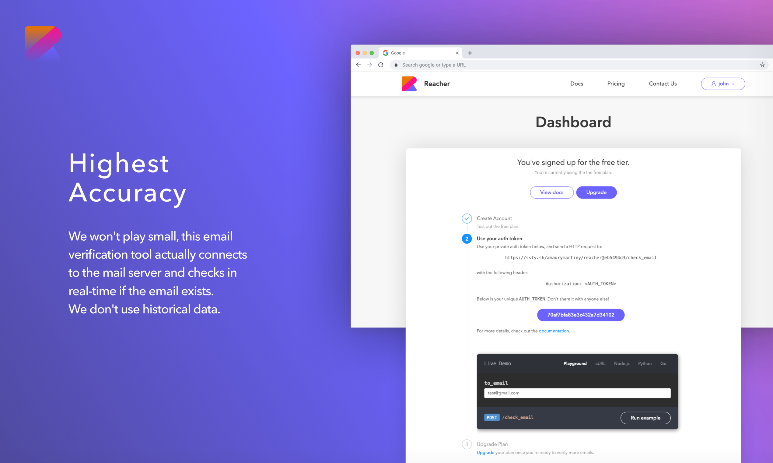 Reacher allows you to check if an email address is deliverable or not, it's useful for: - preventing spam sign-ups on your website, - and cleaning up mailing lists from junk emails. This has been a long journey. It started as I was looking for an open-source alternative to Hunter, NeverBounce and Clearout, but couldn't find anything reliable, so I wrote one myself. When I uploaded it on Github, it received some positive traction. I then started to turn Reacher into a Saas, and today, I am thrilled to launch Reacher! Some more details about Reacher: - Accurate - it actually connects to the mail server to check deliverability - Written in Rust - Privacy-focused - Uses Tor to avoid getting blacklisted - Scales well - Checks MX, SMTP, catch-all, DEA... and more - 100% Open-Source - Free for personal use