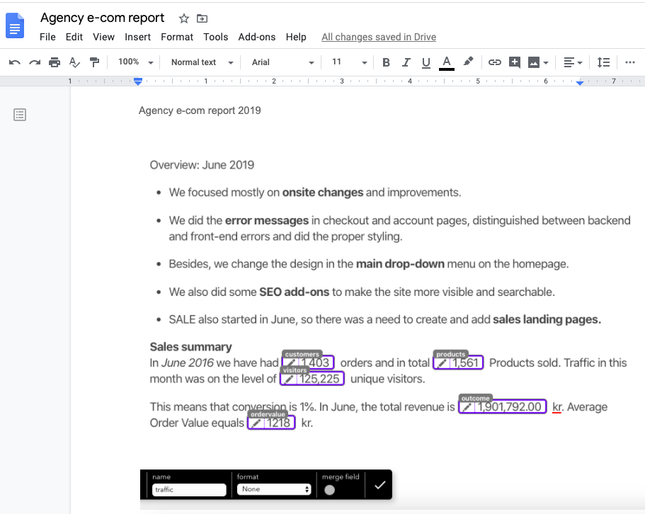 Reactivepad lets you put calculations directly inside your textual narrative. Expressions can live anywhere in the document, even in the middle of the sentence. For referencing formulas use meaningful names instead of obscure grid coordinates. Stay in the editor and don't waste your time on the unnecessary routine of switching between spreadsheet and doc. You don't have to worry about manual correcting, regardless of how often the data changes. Create truly smart and reactive data-driven documents that are almost like apps!