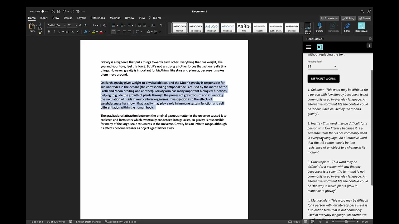 Read Easy makes text more understandable. As a user, you are able to use Read Easy to check if your text is simple enough for people with low literacy skills. You also receive feedback on which words or sentences you need to change and why they are too difficult. Furthermore, you can find easier synonyms for your words or help make your text understandable for people with dyslexia. ✅ We make text more understandable on different reading levels ✅ Get feedback and improvements suggestions ✅ Get Synonyms on different reading levels ✅ We can filter facts from text ✅ Multiple language support (English, Danish, Dutch, French, French, Norwegian, Polish, Portugese, Russian, Spanish and Swedish) ✅ Dyslexia checker Read Easy offers a freemium model, which includes a Free plan with limited use. There are also Premium, Small Business, and Enterprise plans available for those who require additional features or more extensive usage. You can choose a plan that best fits your needs. Please find all prices and subscriptions here.
