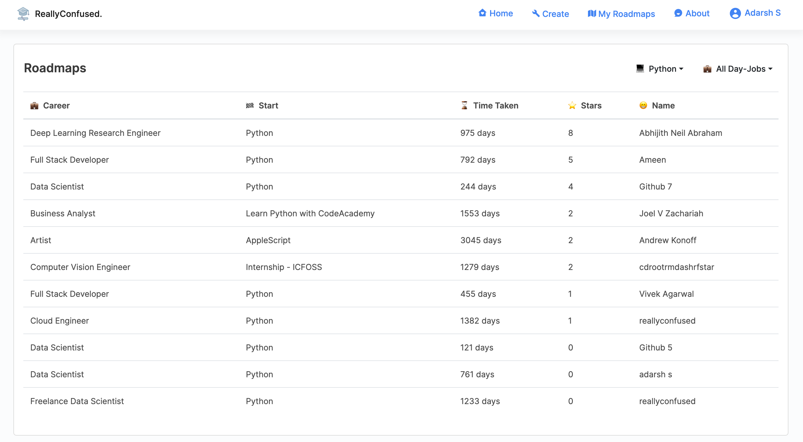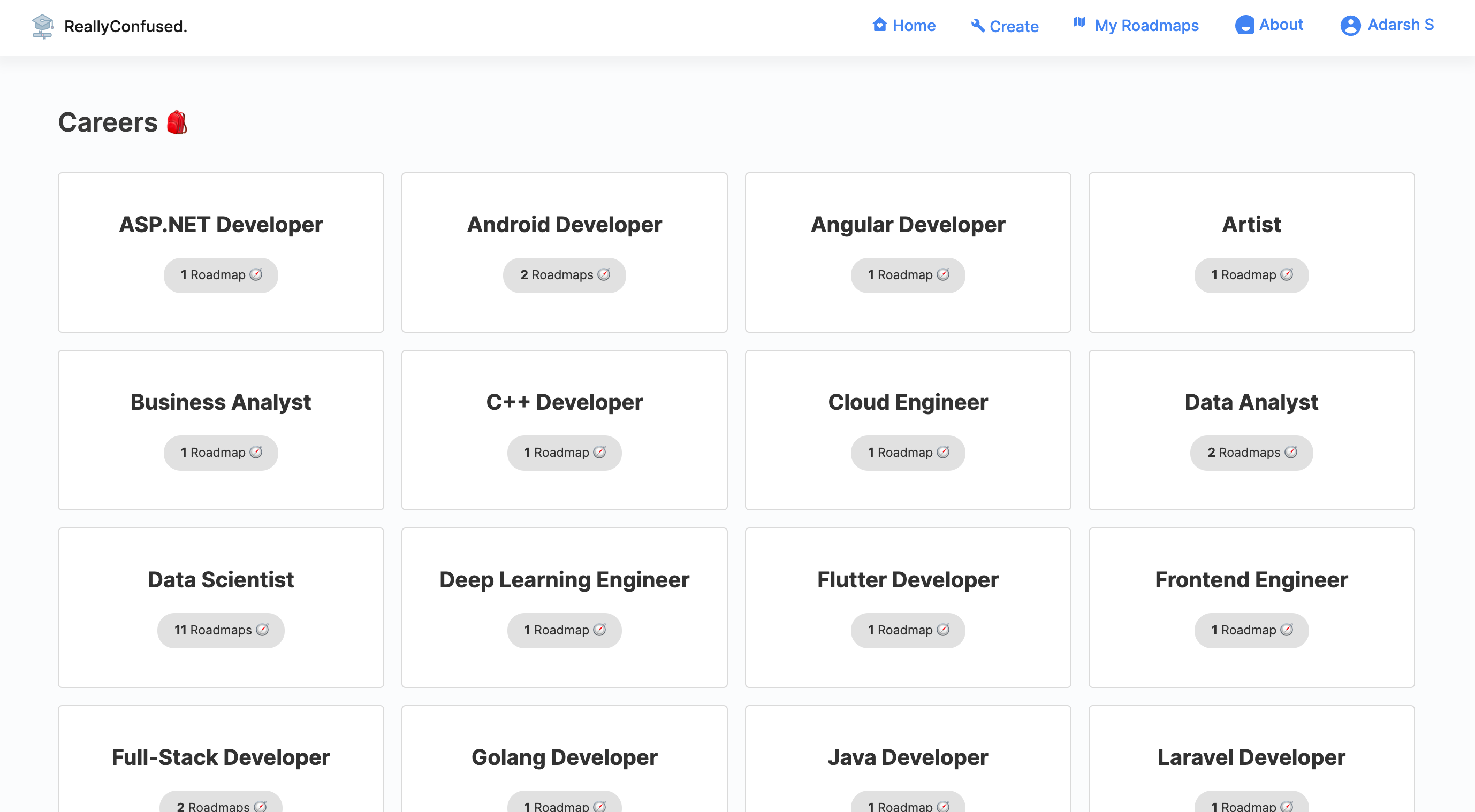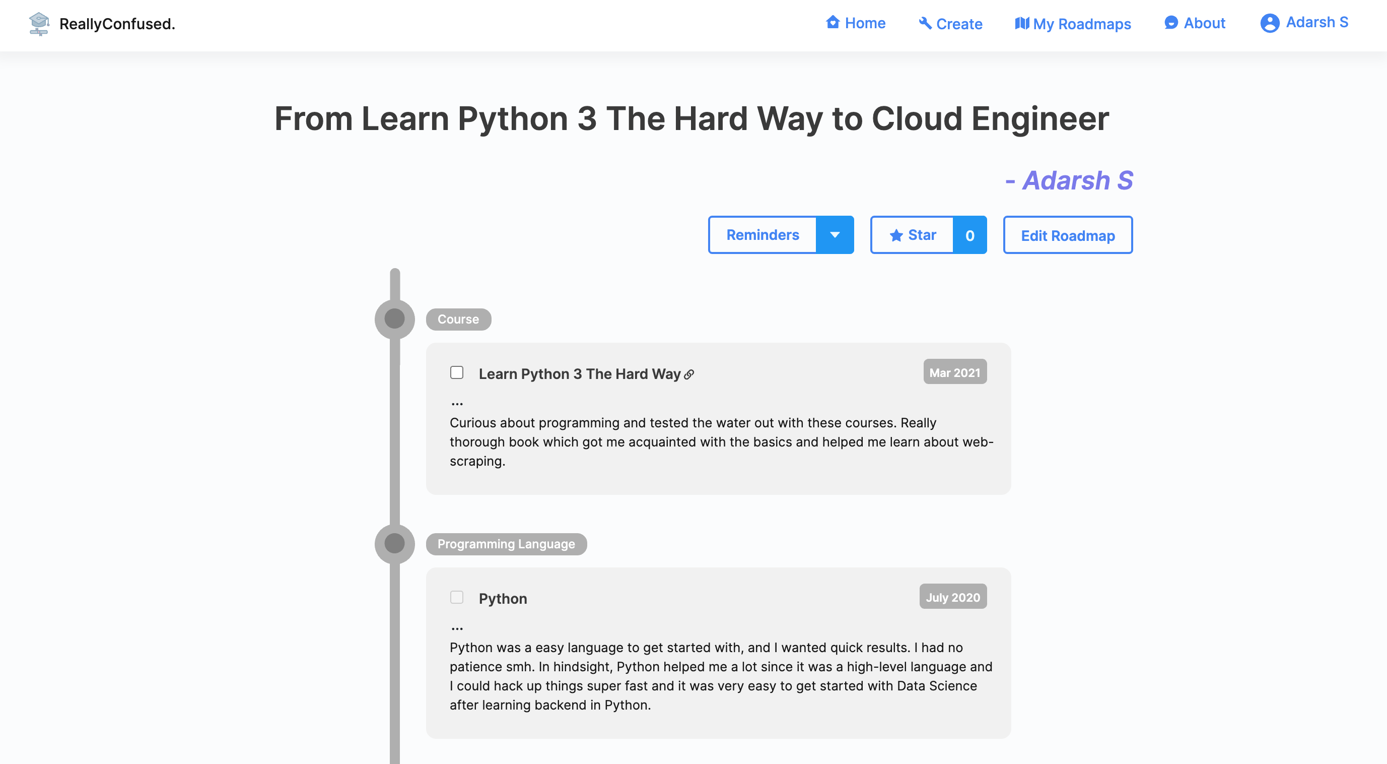 Hey folks! Four years ago as I was learning to code, I was frustrated about my lack of clarity about where to go and whom to learn from. With overwhelming career choices within tech and everchanging programming languages and frameworks, the first few months were painfully hard for me. Six months ago I decided to revisit this problem again and came to r/learnprogramming to talk with folks to see if they still faced this problem. After talking to about 100+ people who were learning to code, and they very much did. To solve this, I decided to build a web-app to curate and share learning roadmaps where people who are new to coding can have more clarity regarding how to go about building their tech career and hopefully not face the problems which I did. You can also "pursue" which is basically forking a roadmap and make it your own to pursue it and build your own career goals and get weekly reminders to update and pursue your roadmaps. I managed to get over 50 learning roadmaps on a variety of careers and programming languages which I gathered from my friends, network and the internet and it's only increasing by the day! If you want to give back to the community, feel free to build your own roadmap and share your journey with the people starting out! I released it last-week on r/learnprogramming and it ended up getting 4000+ upvotes validated the requirement for such a product. I'd love your feedback and your criticism to know how I could make this better. Best Regards, Adarsh S