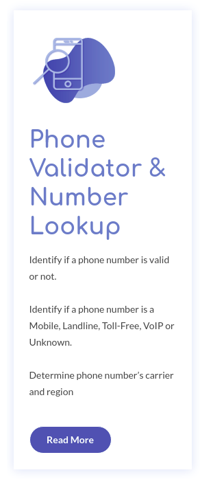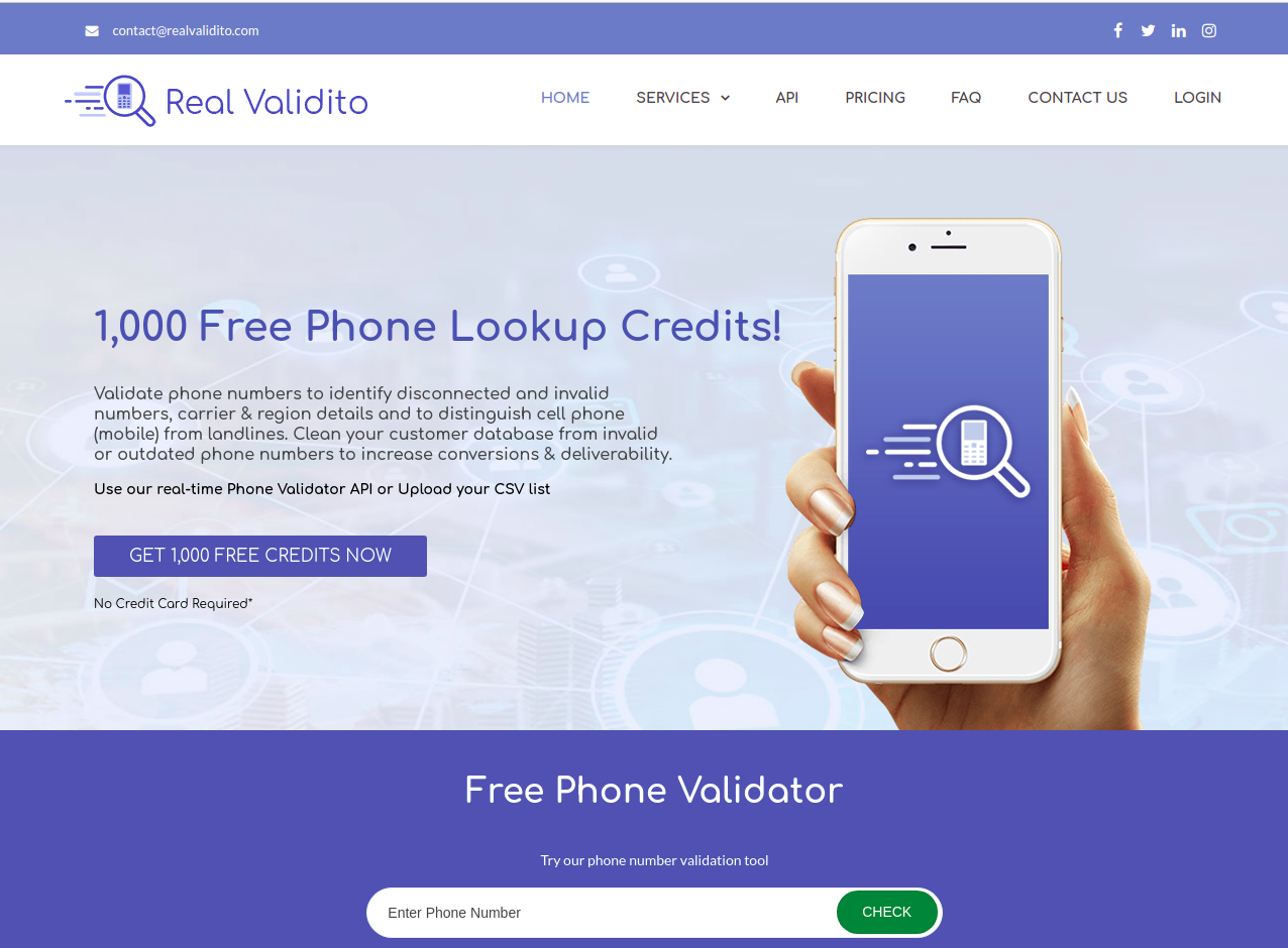 Real Validito [Free Phone Validation & Carrier Lookup] Free, real-time phone number validation service provided by Realvalidito.com. Check if the number is real and valid, mobile or landlines and find carrier & region details. Easy to use our Phone Validator API or Batch Validation (Bulk Phone Number validation / Phone Number List Cleaning).