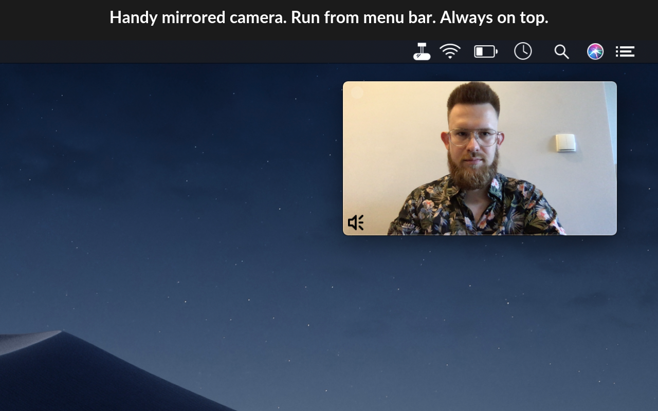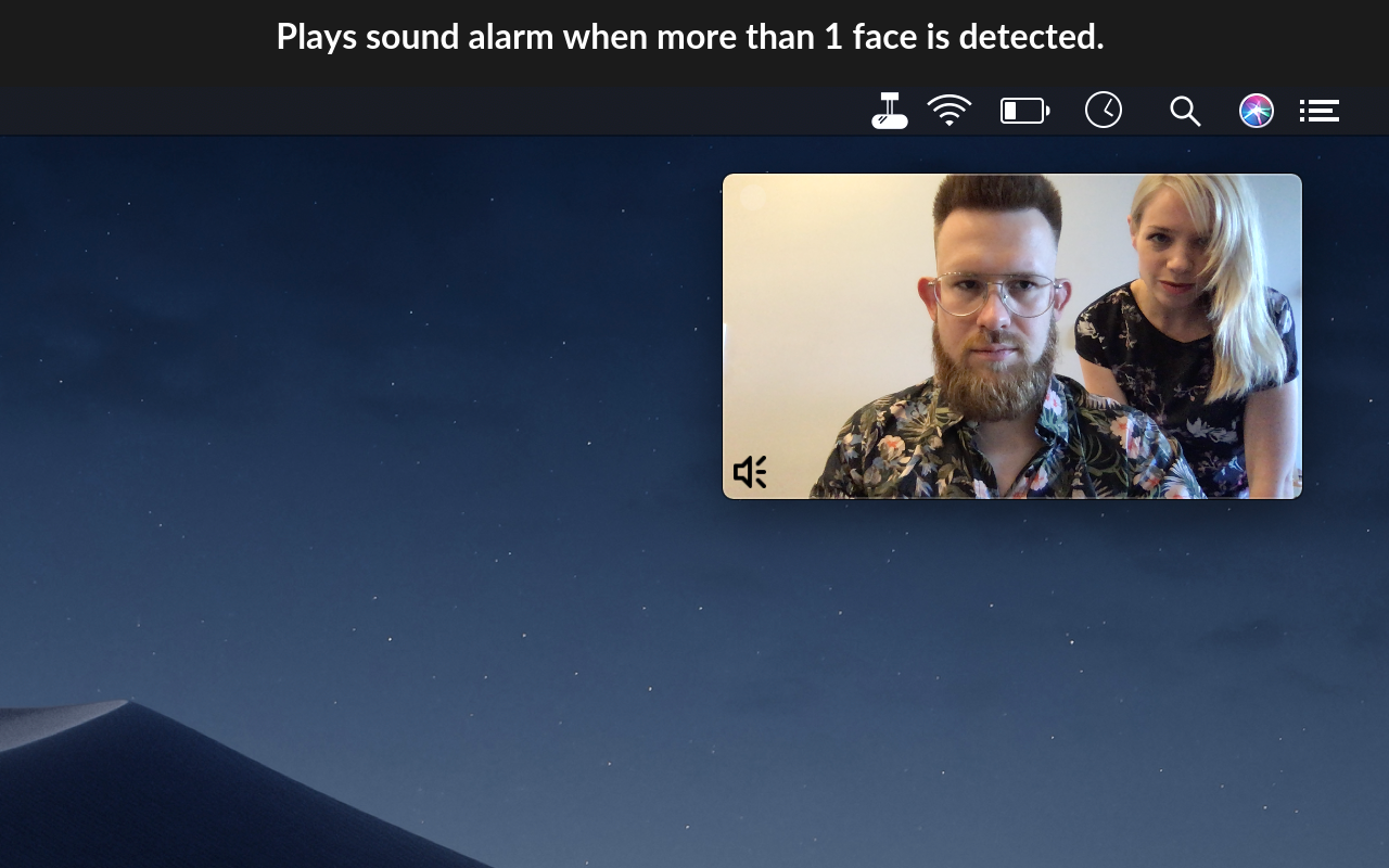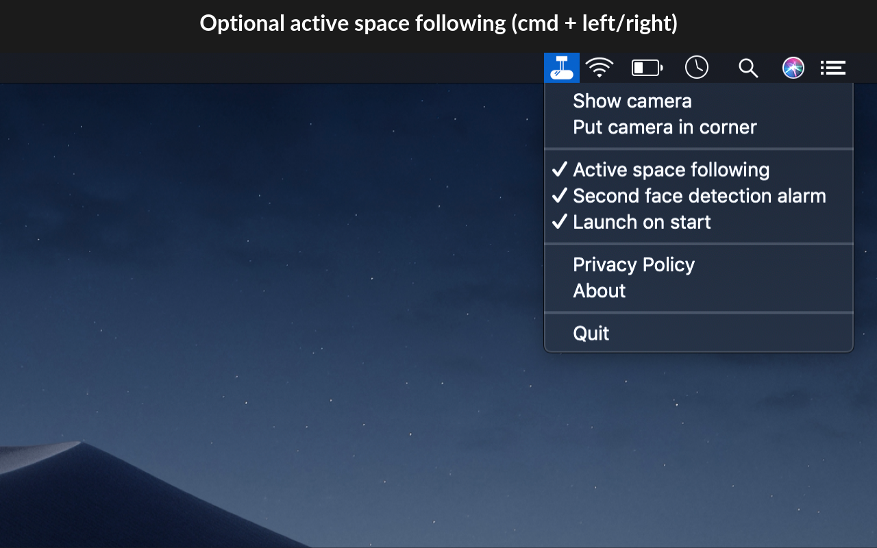 Menubar app that shows the current mirrored image from your default camera. It protects you from unwanted staring at your screen by other people. Features: Always on top, even when other apps are on full-screen mode. Optional active space following (when you change desktop space by cmd + left/right camera window is visible in new space). Optional sound alarm when second face is detected. Optional launch on login. Resizable.