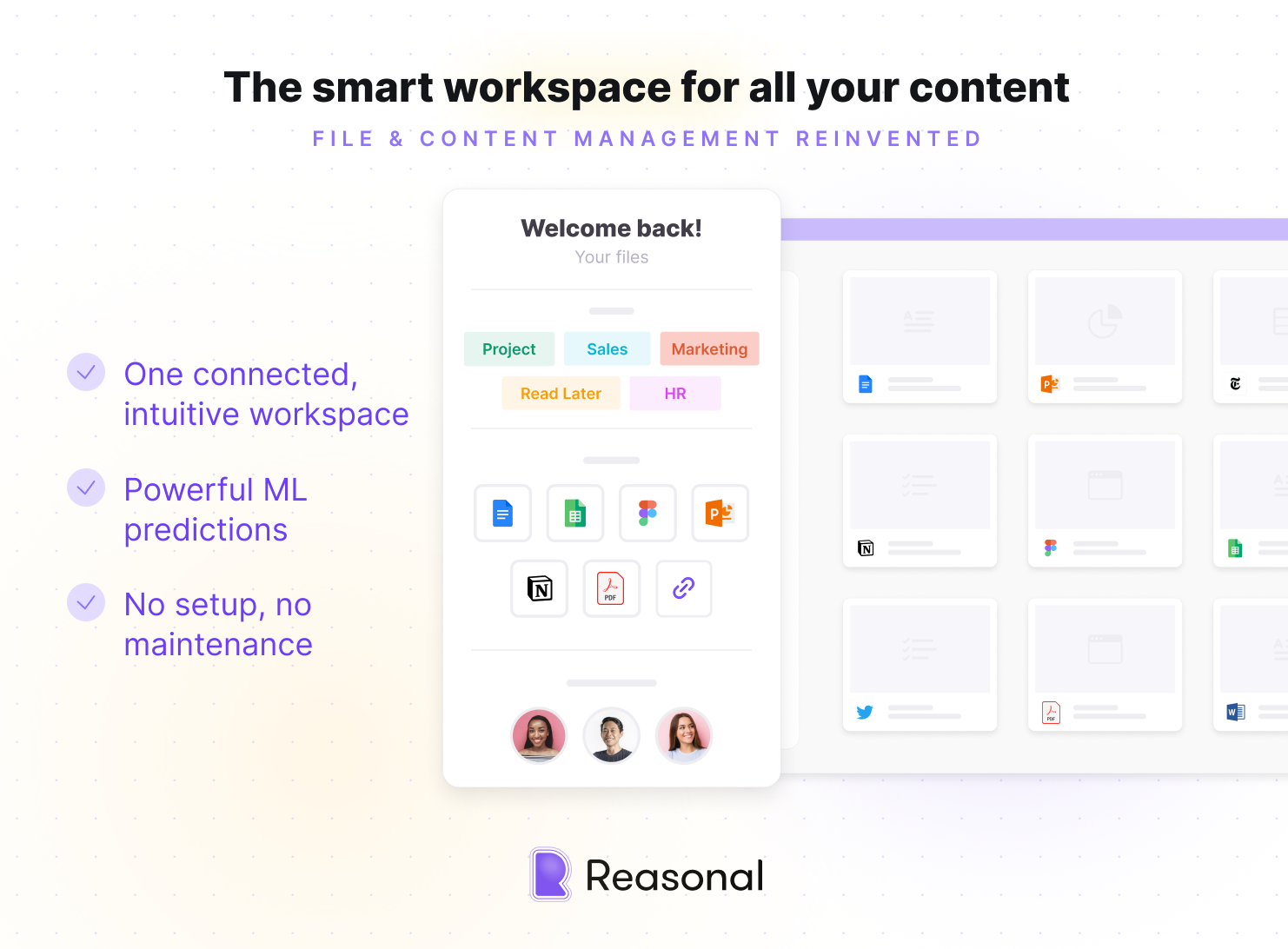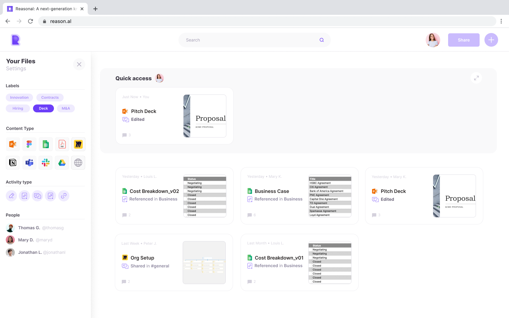 We're building an ML-(graph-)based tool that reinvents file & content management - and are just onboarding our first beta users! It's already difficult to keep track of your files, codes, contracts, email attachments, and PDFs, and gets worse when you include your Figma/Sketch/Miro/Notion pages or web links to interesting articles or firms. Put this into a remote setting, where you communicate via Slack or MS Teams, and you see how 30% of the average "digital worker's" (that's us!) time is spent searching and locating files, as well as communicating & collaborating internally? We're tackling the problem with an intuitive UI and a powerful machine-learning core to bring structure and transparency into your work content across your docs, files, Google Drive, Dropbox, Slack, MS Teams, and browser bookmarks. If you would like to give it a try, add yourself to the waitlist and get early access to our closed beta: https://rsn.al/iefhSZ6 If you fill in the survey via this link and are onboarded on the closed beta, you'll get grandfathered and be our VIP forever :)