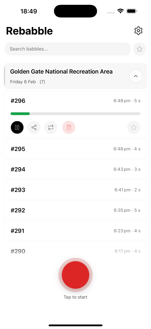 Rebabble is a lightweight audio recorder for moments that happen before you can hit record. It is designed for baby sounds, bird calls, and short everyday moments. Core flow: 1. Tap once to start listening 2. Sound is detected automatically 3. Snippet is captured and played back immediately Built with a privacy-first approach: - Recordings stay on-device - No account required - Works offline