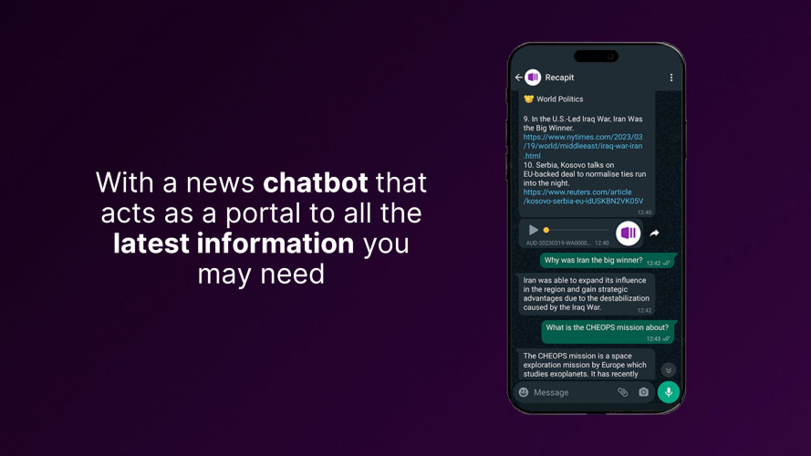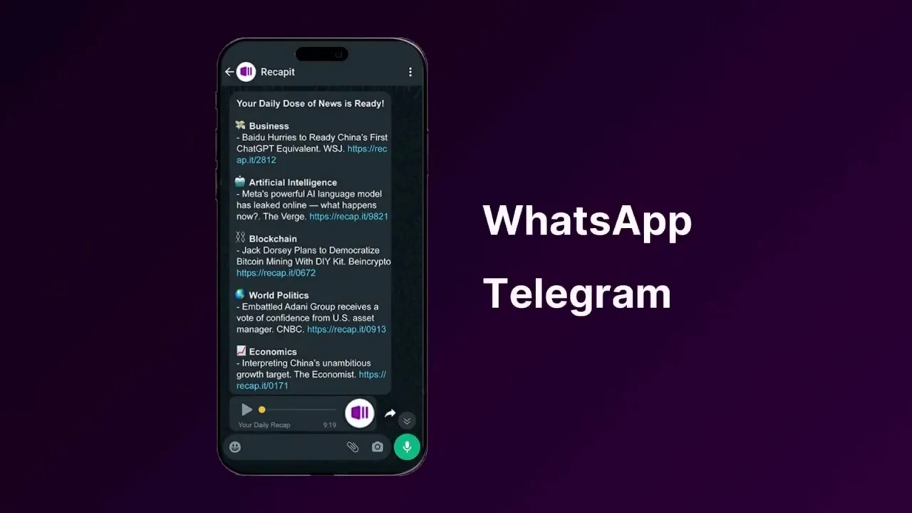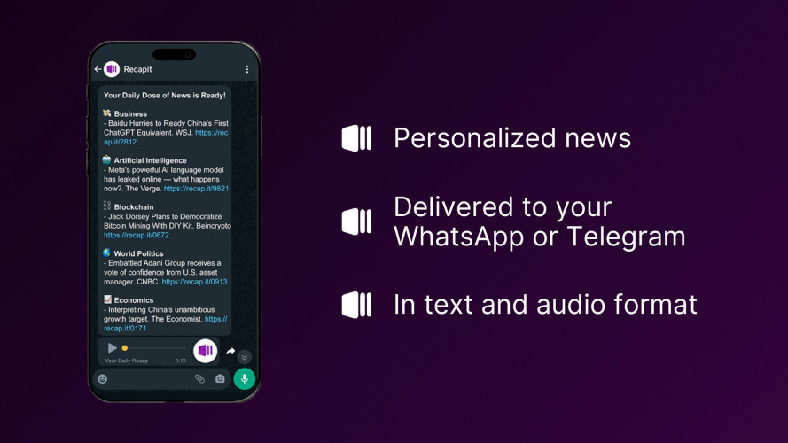 Recapit is an AI-driven platform providing daily tailored audio news summaries. Create custom categories, prioritize top interests, and receive personalized recaps on WhatsApp or Telegram. Use the chatbot to explore stories further. Stay informed smartly.