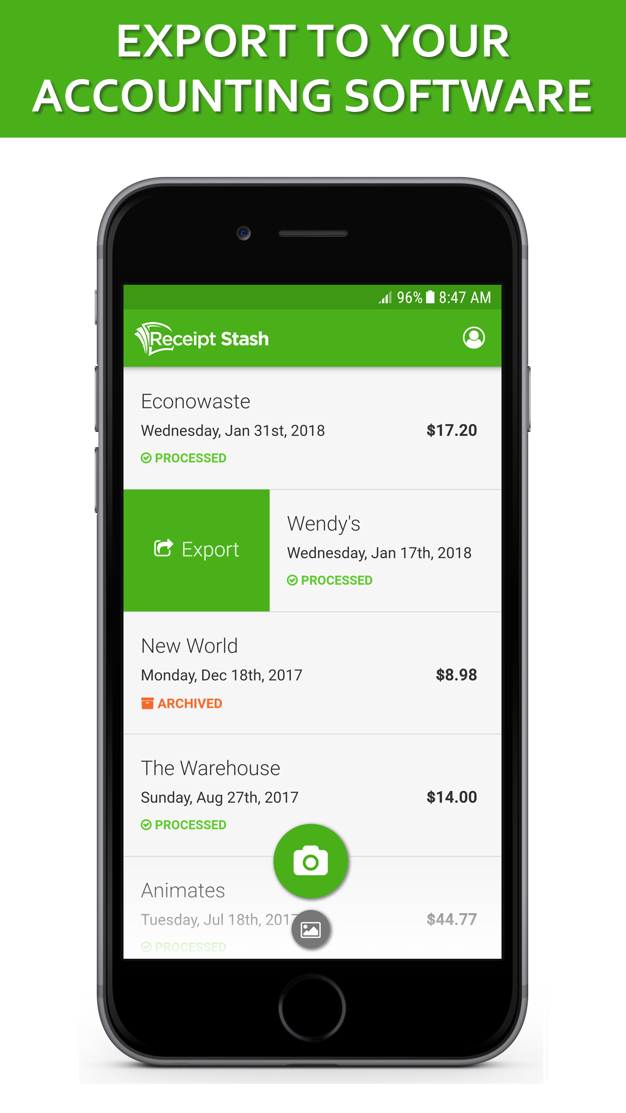 Receipt Stash simplifies accounts payable bookkeeping by automatically extracting expense information from any receipt or invoice, and automatically categorising expense items using dynamic supplier rules. All expense items are stored securely in a single, easily searchable cloud based account and can be published to your accounting software with the push of a button. Say goodbye to manual data entry! Submit expense items to your cloud account using a number of methods: Mobile app - simply take photos of your receipts using the app for Android or iPhone File uploader - upload expenses directly via the web app Email in - email receipts or invoices directly into your account using your unique Receipt Stash address. Import apps - automatically upload receipts and invoices by integrating with our import app options such as Dropbox.