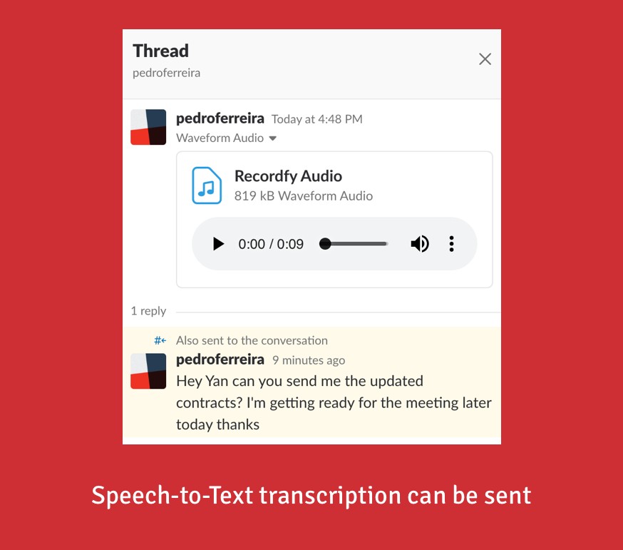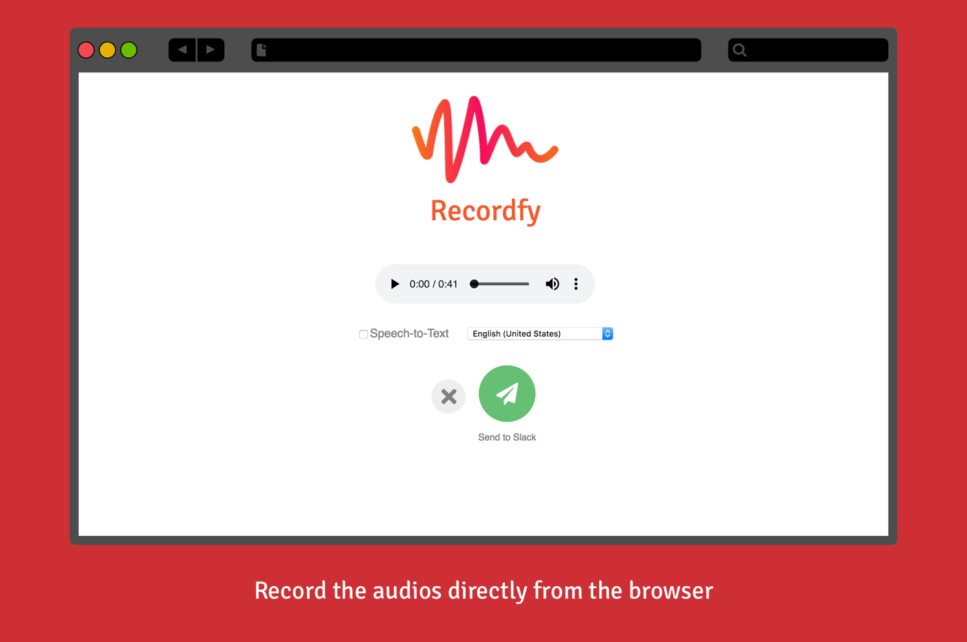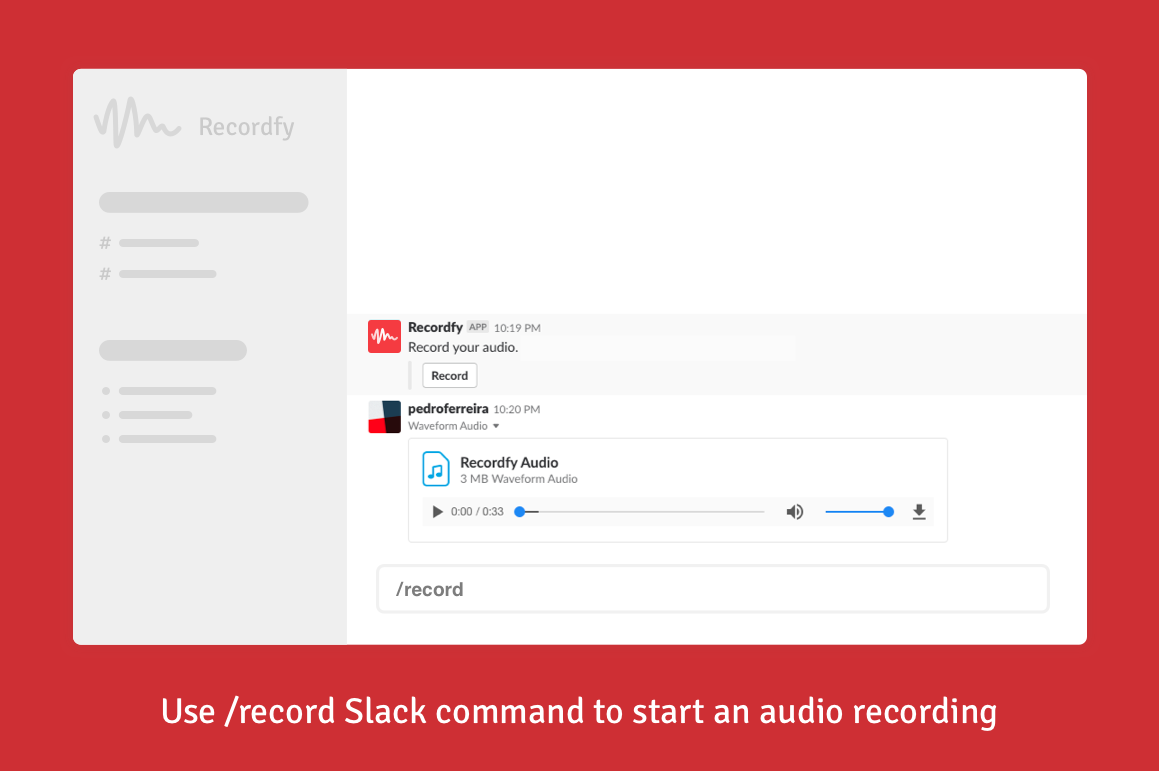 This is the easiest way to send audio messages directly on Slack. Simply use /record slash command to start recording your audio. No external integration needed! When you're finished, your audio is uploaded to your Slack channel or direct message as an attachment. You can also take advantage of our Speech-to-Text feature (beta) to have the audio transcription sent to your Slack automatically: • users can preview the audio without having to listen to it. • audio transcript is indexed by Slack, so users can search for it later and easily find the associated audio; • powered by Google Cloud Platform, the best speech recognition software available; • more than 100 languages supported; Start your 14 day free trial, no credit card required. After this period, services are billed as explained in our website https://recordfy.co If you have any questions, get in touch with us: [email protected]