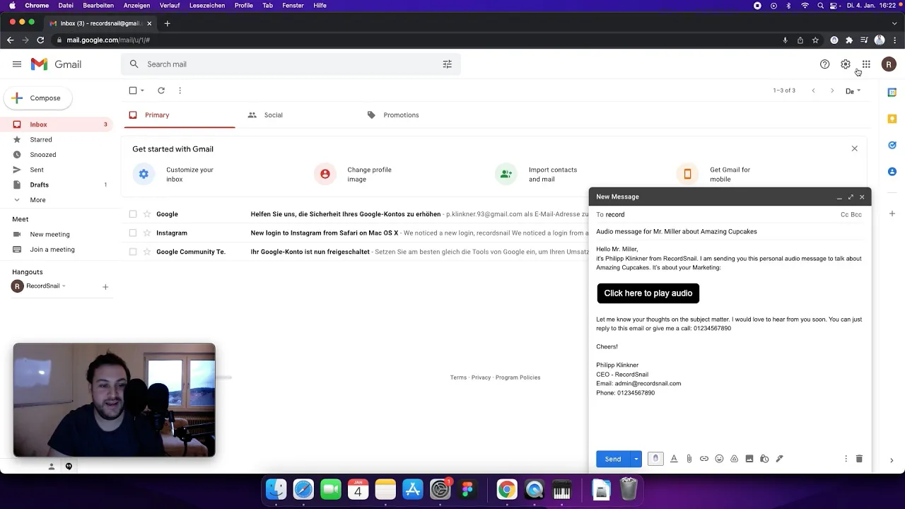 RecordSnail is a Chrome extension that lets you record audio messages with just a few clicks. You can use our innovative Software as your new business tool and stand out from the crowd of unappealing text-based emails that your prospect doesn't pay that much attention to. Build real connections with the power of audio by simply recording your message and put in the recipients data - that's it! RecordSnail creates a catching email and inserts a button that links to your audio. Every email you send is tailored to your prospect with our variable feature - so your recipient gets a personal email. As soon as your prospect clicks on the button he can play the personal message you recorded for him and can directly contact you with just a click. The RecordSnail extension works with with Gmail Interface but you can connect any other email address to your Gmail Interface and get started with RecordSnail right away. Whether you are an introvert or extrovert, whether you do marketing, design, sales or something else: ‍ RecordSnail helps you to get more customers!