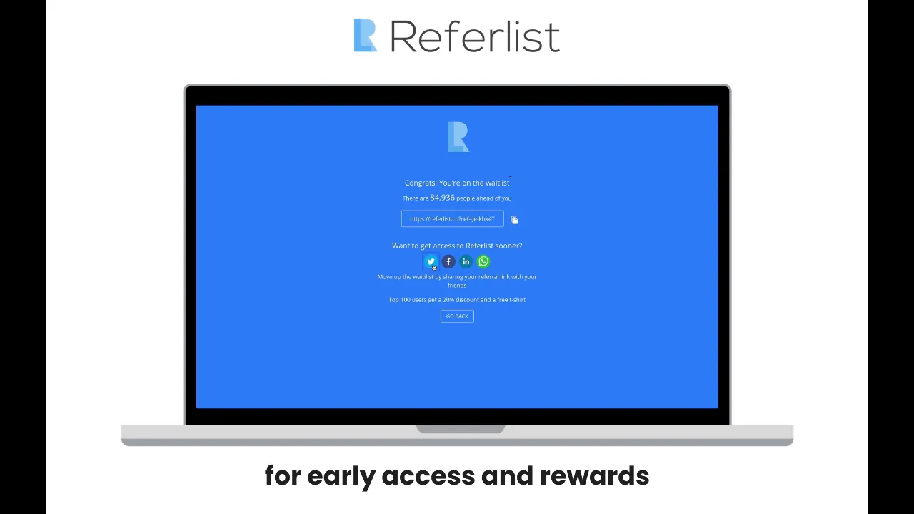 Referlist is a plug-n-play waitlist that requires no code to setup. Users sign up for your pre-launch product via our sign up form that you can embed on your page. We take them to a branded waitlist page that shows them their position in line and gives them a unique referral link to share with friends. Every time a friend of theirs signs up and verifies their email on your site, they move up the waitlist. You get more sign ups and your users move up the waitlist for a chance to get early access to your product or rewards.