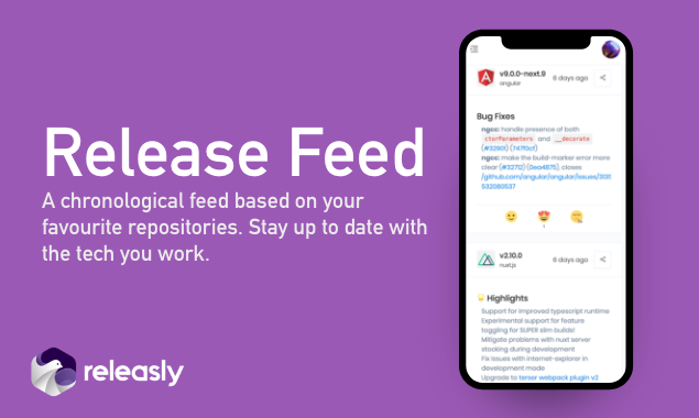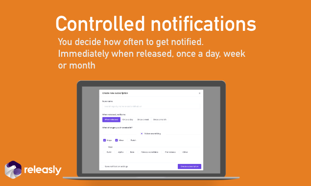 Releasly is a free tool to monitor new open-source releases. Follow your favorite libraries and get an email notification when new releases is available. You can choose the release types to follow(major, minor, etc...) and the notification interval (immediately, daily, weekly, monthly).