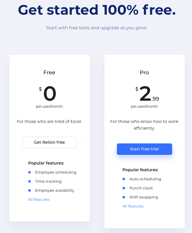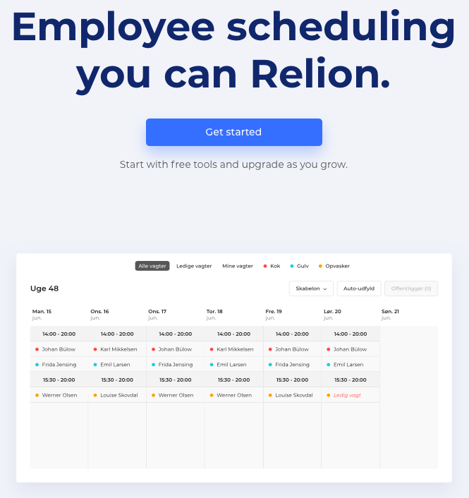 Employee scheduling you can Relion. Our mission is to make simple scheduling accessible to everyone. Relion brings together everything you need to replace your old ways of scheduling with a new and simple solution that saves you a lot more time. Relion takes care of the entire scheduling process and ensures that you can turn your head off and look forward to planning your employees shifts without worry. Automatically fill out the vacant shifts in your schedule with just the click of a button, taking into account employee availability and an even distribution of working hours. Our free version is free forever!