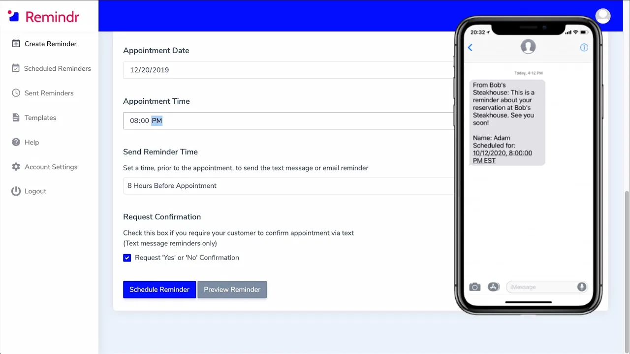 Remindr.co is a tool for small businesses to schedule automated email and text message appointment reminders. Reduce your meeting no-shows by alerting your clients at a predetermined time. Easily confirm appointments with your customers via text message. The tool is simple and easy to learn. You can schedule reminders on our website using just your keyboard or mobile device. Reminders can be personalized for each client. You can also make and save your own reminder message templates to make the process easier and faster. Remindr.co is great for any business that schedules customer appointments or client meetings. Our top use cases are restaurant reservations, nail salons, personal trainers, barbers, tattoo shops, spas, real estate agents, independent car mechanics, tech sales scheduling customer calls, and more. Take a look at the product tour YouTube video for a 5 minute demo. The product tour video is available on our homepage. Make a free account today at https://remindr.co. No credit card or commitment required.