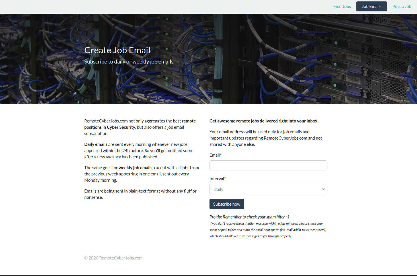 RemoteCyberJobs.com aims to be the go-to resource for discovering awesome remote jobs in Cyber Security around the globe. The idea behind RemoteCyberJobs.com is to provide an ultra-focused, fast and lean job site with a super-simple job email service. All without any fluff or nonsense. Listed jobs are carefully aggregated from selected sources and appear on the front page for 45 days to always keep your job search fresh.