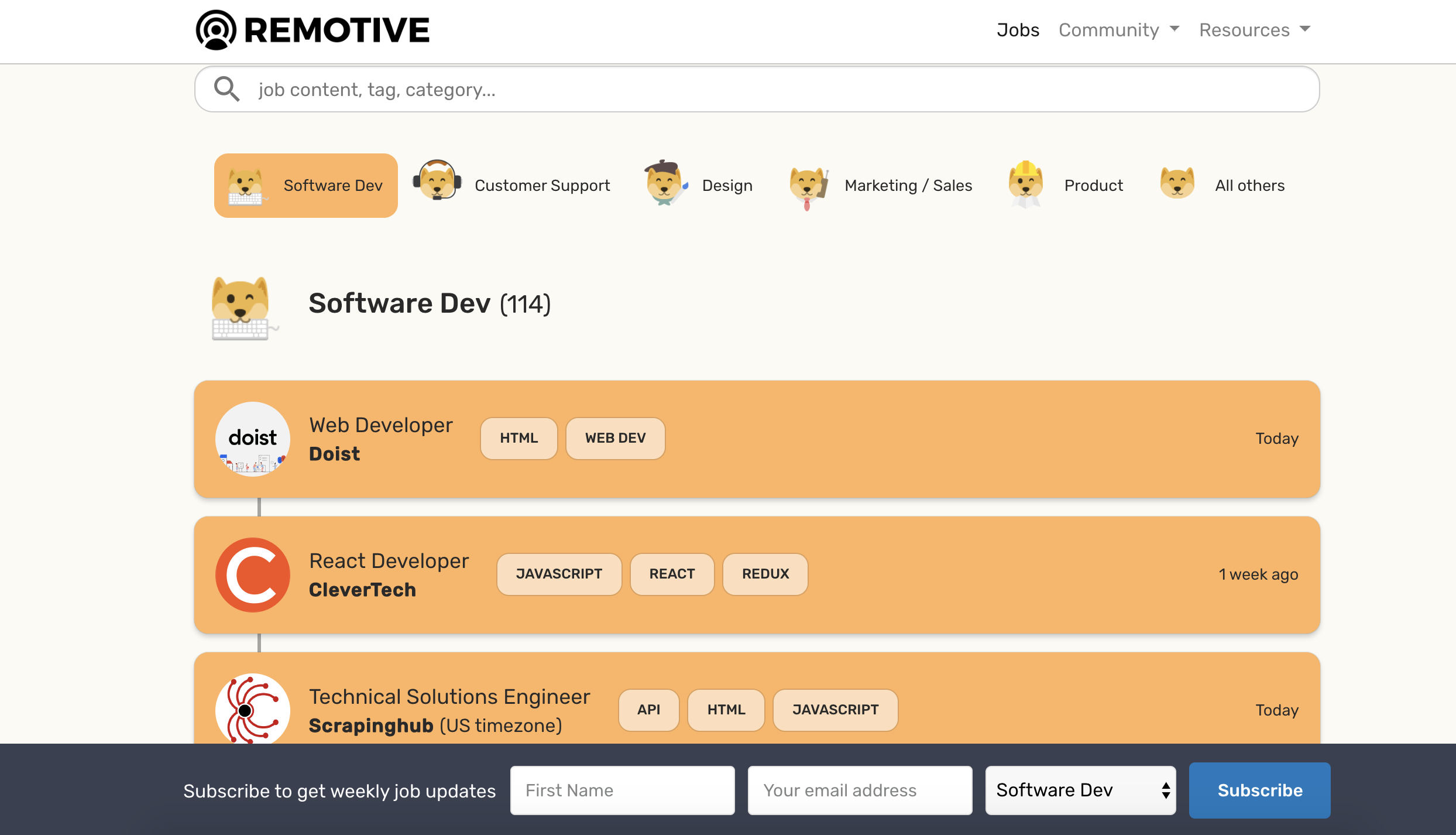 We believe remote work is the future of work. Remotive connects tech employees with remote companies. Thanks to our job board & community, you'll never work alone! Remotive helps tech employees land remote jobs. We run one of the largest remote work job board & community > Is this “just another job board”? Nope! Here’s how we’re different: - Featuring exclusive remote jobs, not only StackOverflow/Angelist’s jobs. - Community-driven. Our members are veteran remote workers & remote companies. - Value-driven. We believe remote work comes from trusting employees, not tracking hours. - Curation-driven. All jobs are hand-picked daily, no automatic posting. > What’s new? Never-seen-before jobs, Functional Search, Categories, Mobile-friendly, New Design... We’d love to hear your thoughts, comments and feedback. We’re eager to improve, thanks!