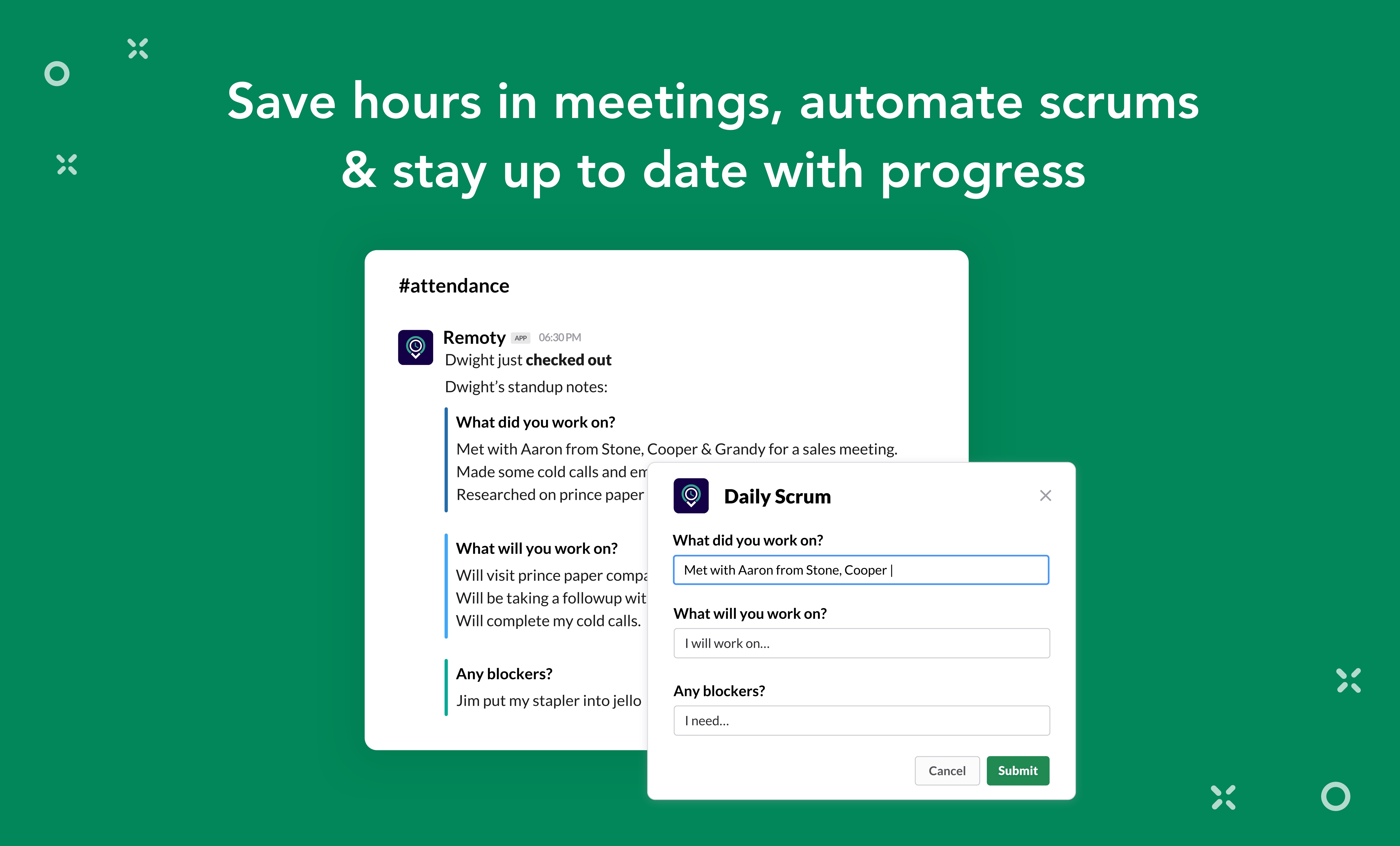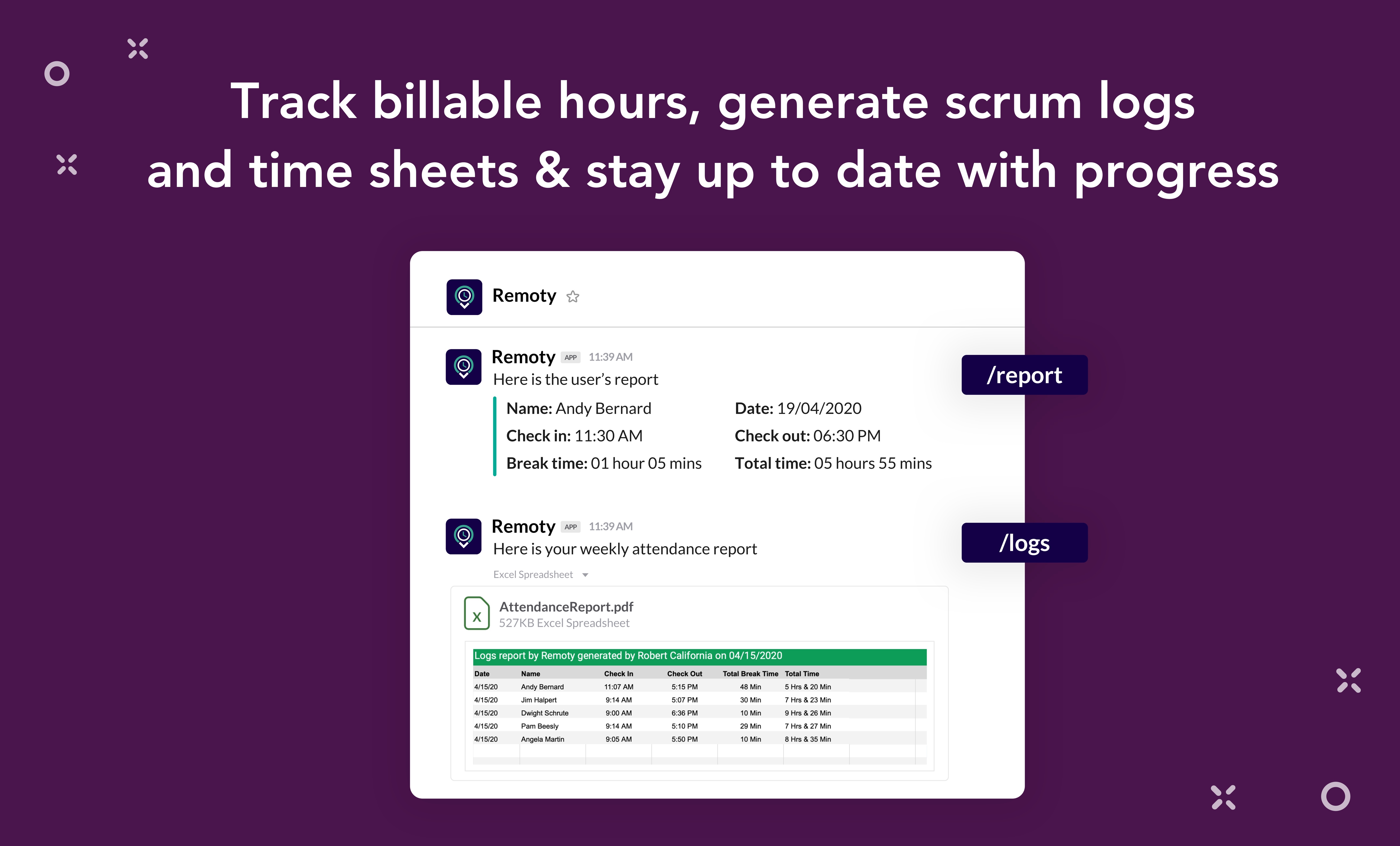 Remoty help teams reach their full potential with powerful time-tracking and progress update workflow in Slack.