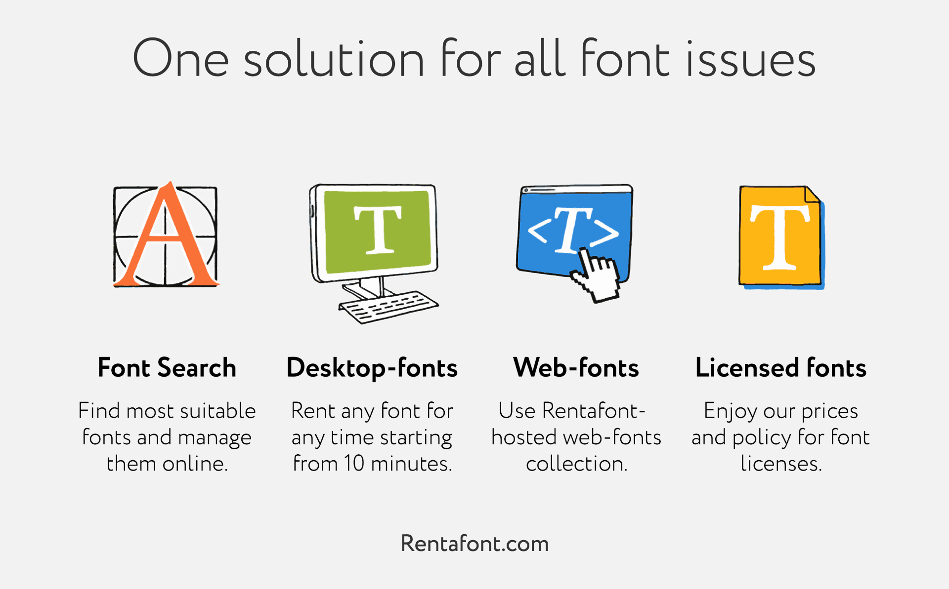 All in one solution including: 1. The unique high secure crossplatform App for rent fonts on demand for minutes, days, weeks, so on. Designers do not have to buy fonts to create websites, logos, posters. Access to fonts is quite enough. A few cents per hour for any font is better than a hundred dollars for a pair of font-styles. 2. Easy access to our web-fonts collection, instead of buying fonts one by one for web-developers, including API access for enterprise clients. 3. Font License price, depended on costs spent on rent for designers and their clients. 4. Unique font search and management. Each font has a semantic core of ~450 keywords in 50 categories on 3 languages. 5. Growing font collection with 2500+ multilingual Desktop & Web fonts by ParaType, TypeType, TypeTogether, 4th February Type Foundry, and other foundries and type designers from different countries.