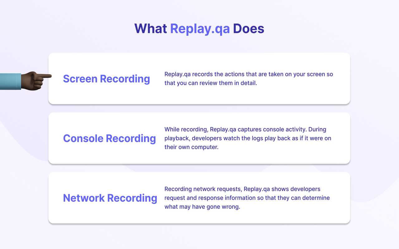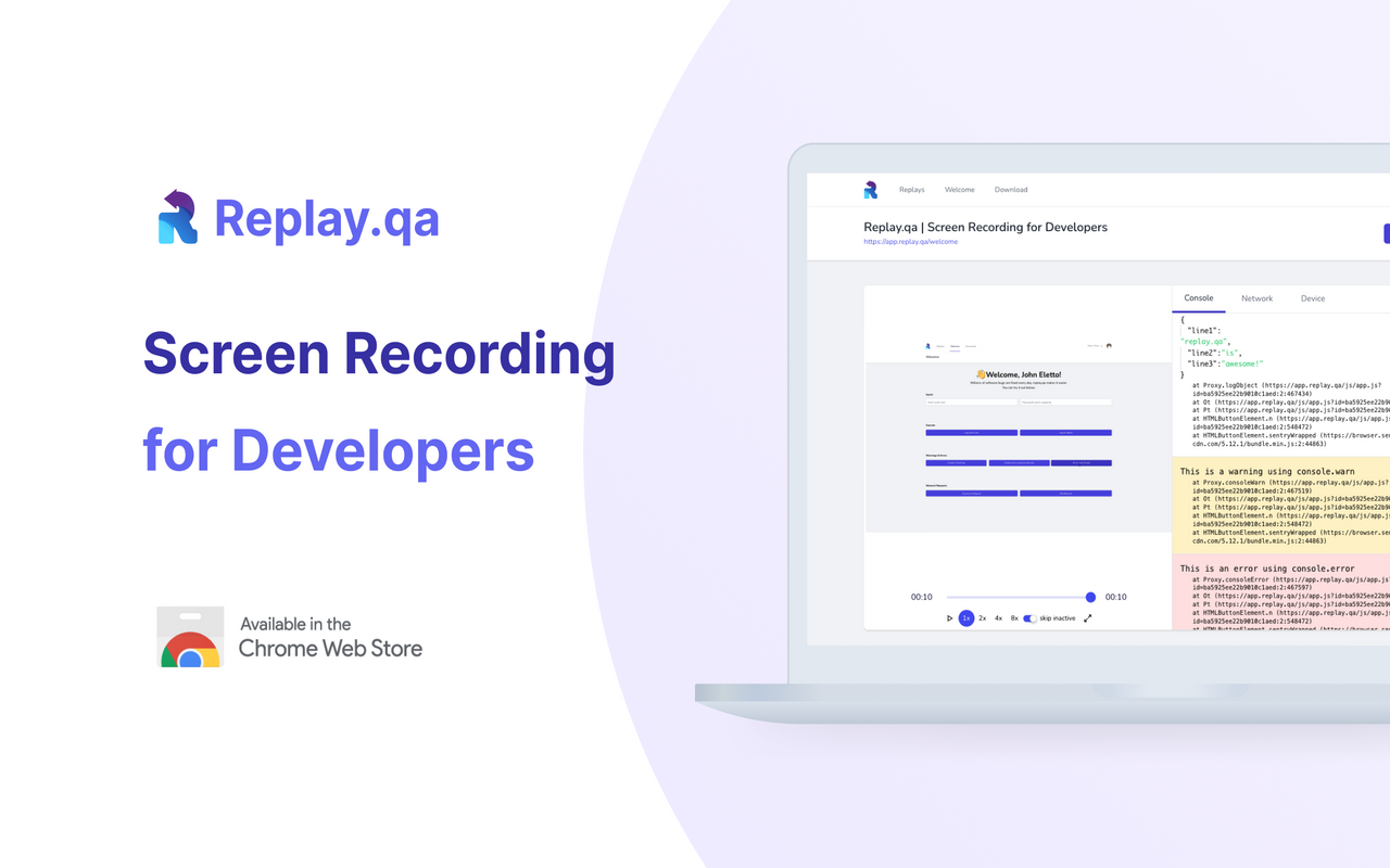 Replay.qa is a screen recording tool designed specifically for developers. With the extension, you are able to record your screen, console, and network requests all at once. With Replay.qa, developers can eliminate the time they waste attempting to reproduce bugs.