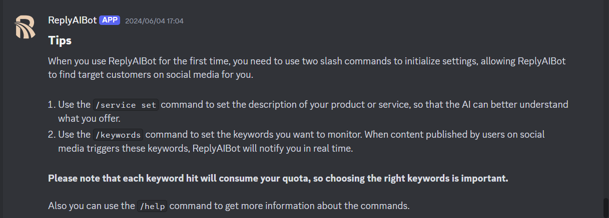ReplyAIBot is a Discord bot specifically designed to find and interact with target users on social media platforms. It monitors social media using advanced AI monitoring technology. Once a post highly relevant to your product or matching monitored keywords appears, ReplyAIBot immediately notifies you and can generate efficient and friendly AI replies. This powerful comment marketing tool can help you manage and optimize your strategy more efficiently, potentially saving you 2 hours daily on your projects!