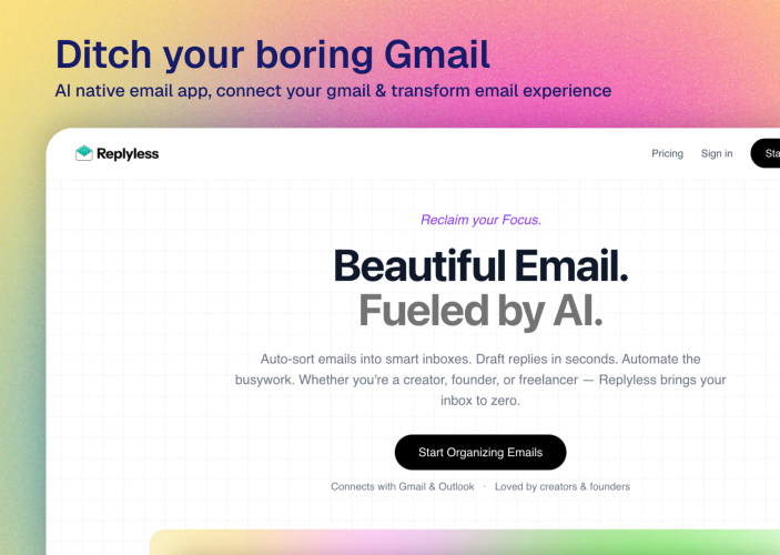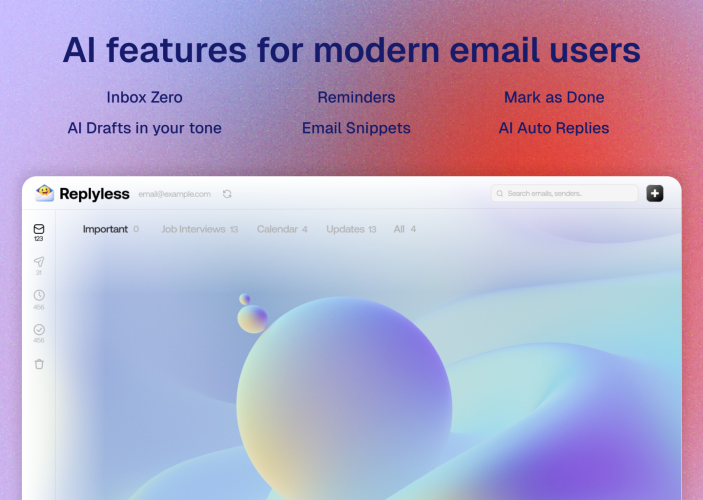 ReplylessAI is a powerful AI email app that helps you hit 'Inbox Zero' and beautifully sorts emails into categories. Finally a solid AI Email Inbox with all the features of popular email apps, and don't burn your pocket. No need to pay expensive subscriptions to Superhuman nor triage emails through clunky command line chats.