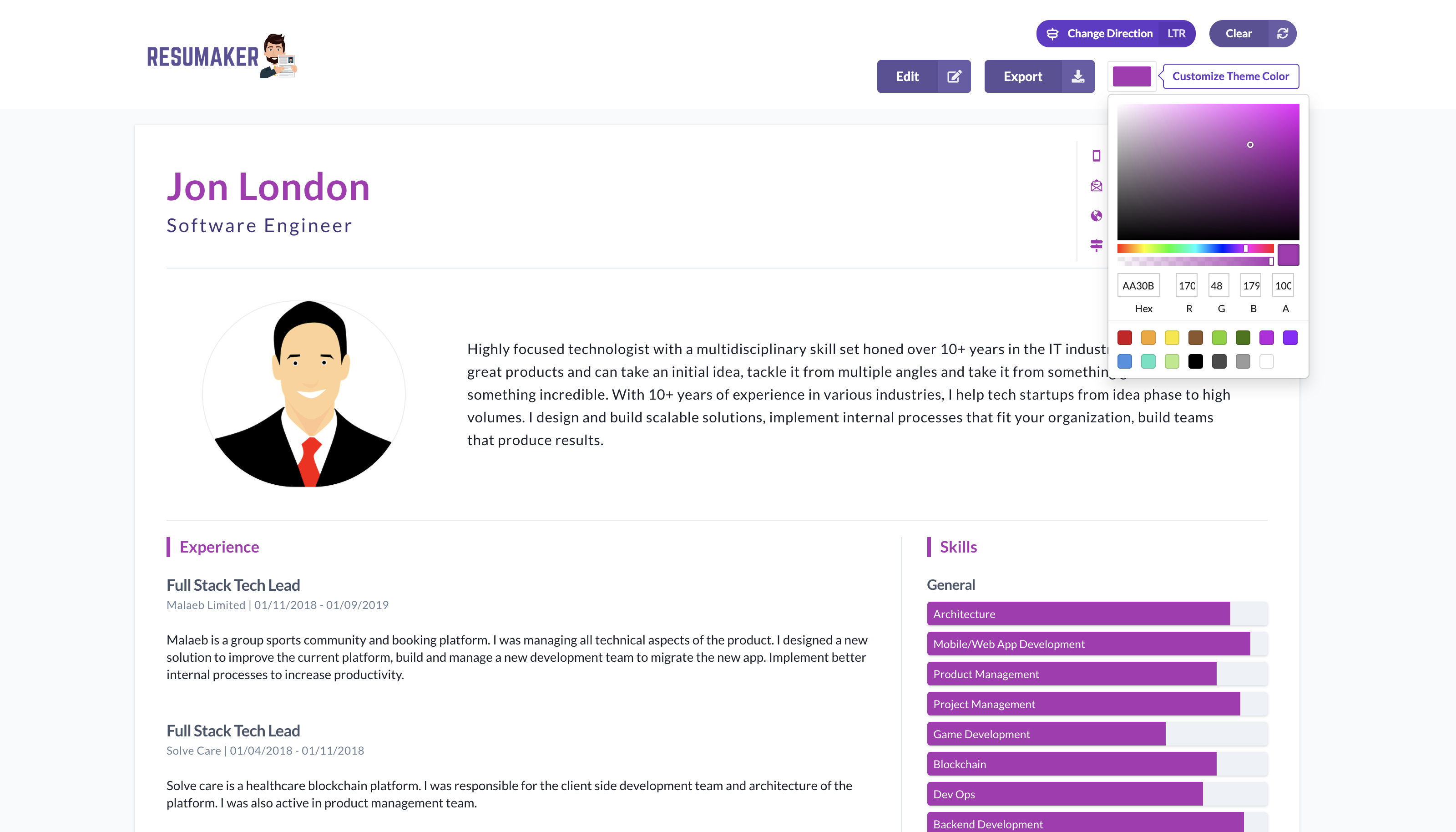 Resumaker is a free professional resume creation tool designed by HR veterans and recruitment experts in the High-Tech & Design industries. Briefly edit, customise and click export to download your resume as an image, pdf or docx file.