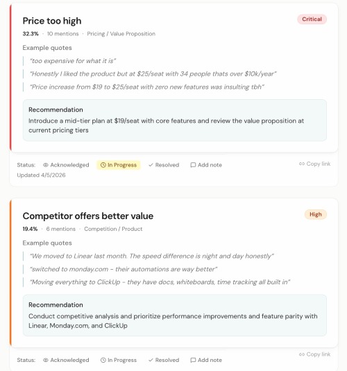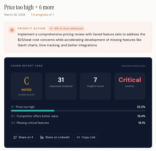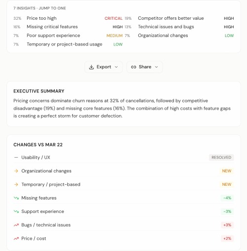 AI-powered churn analysis for SaaS founders. Paste cancellation feedback and get severity-ranked insights with a letter grade (A-F), confidence scores, and specific recommendations. No integrations, no setup. Free tier available.