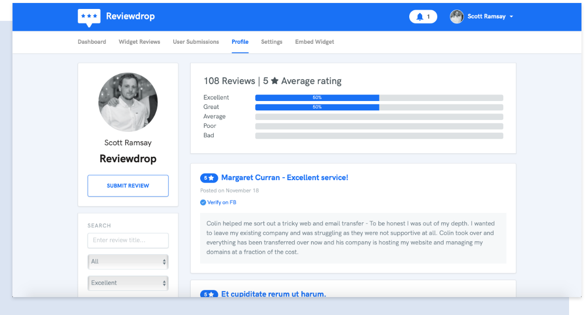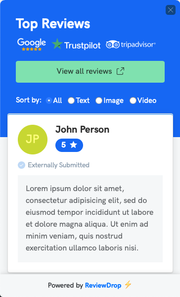 Reviewdrop is a complete review system that allows business or e-commerce stores to embed a widget on their website. Reviews can be added manually from external sources such as, Google or Facebook. Customers also have ability to submit their own reviews as text, image or youtube video. Once a customer submits a review, they can be offered a coupon code off their next purchase. Try it out now, with our full-access 7-day trial - https://reviewdrop.io