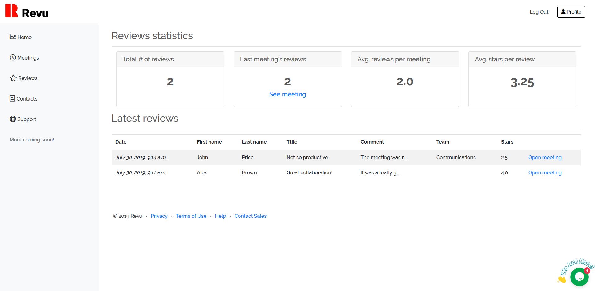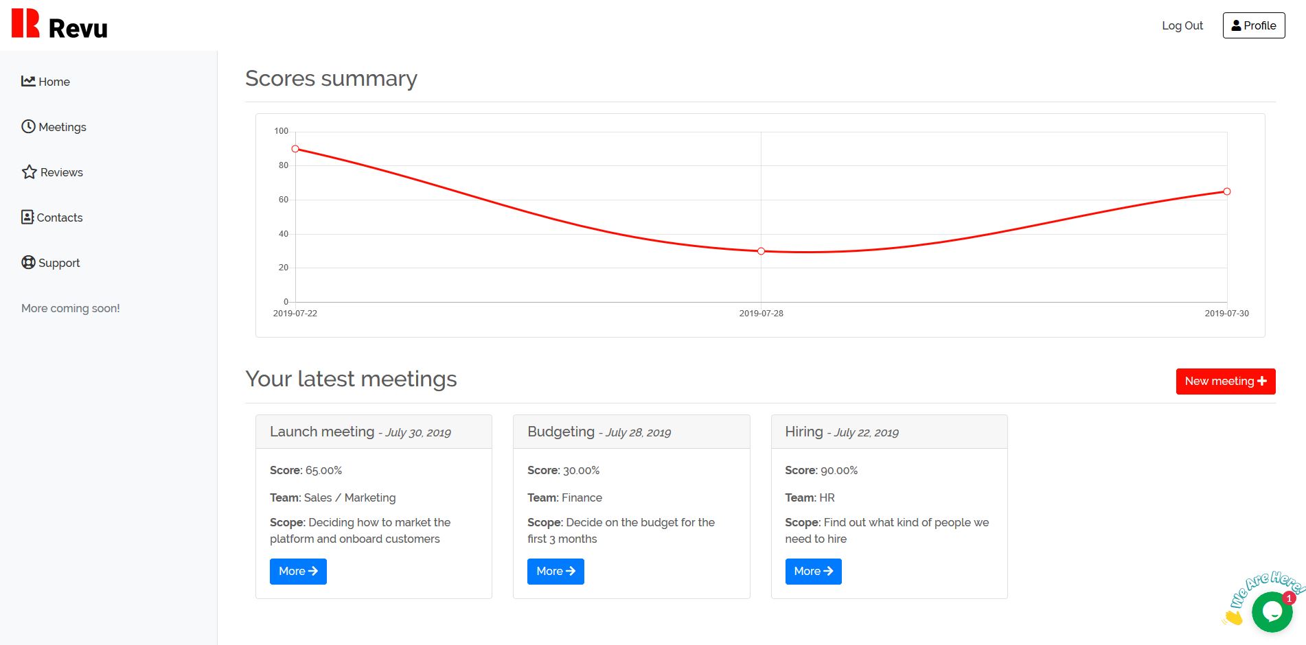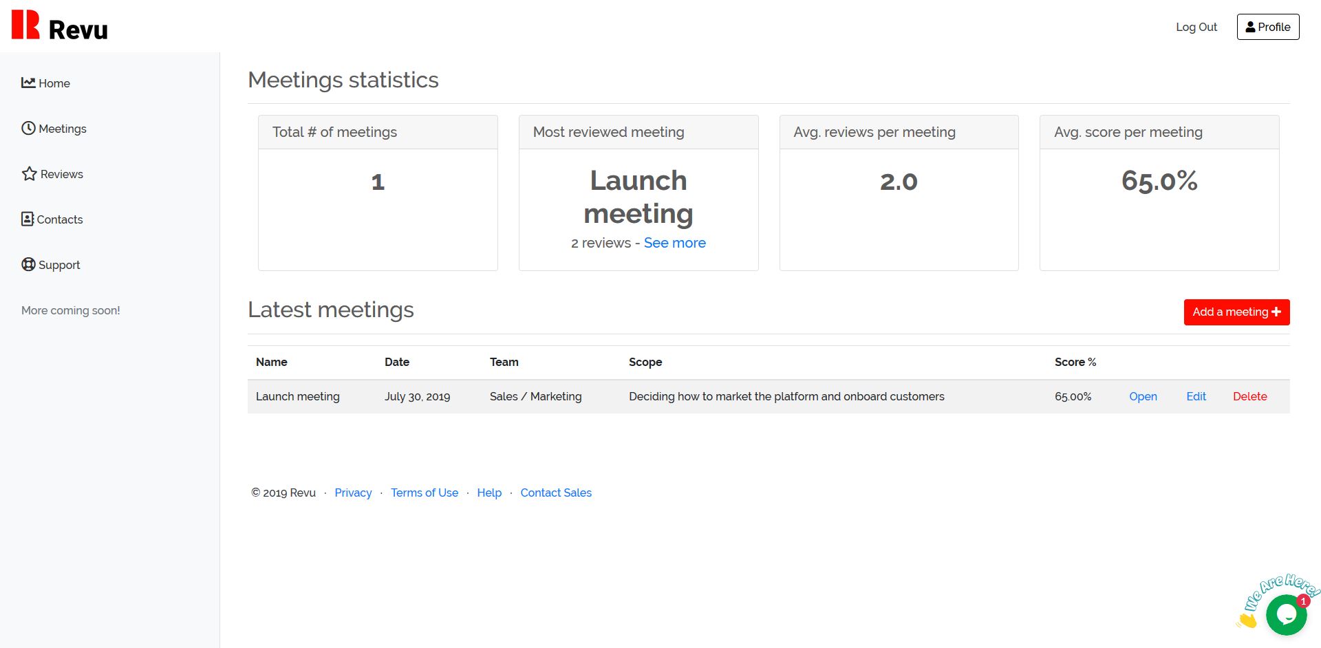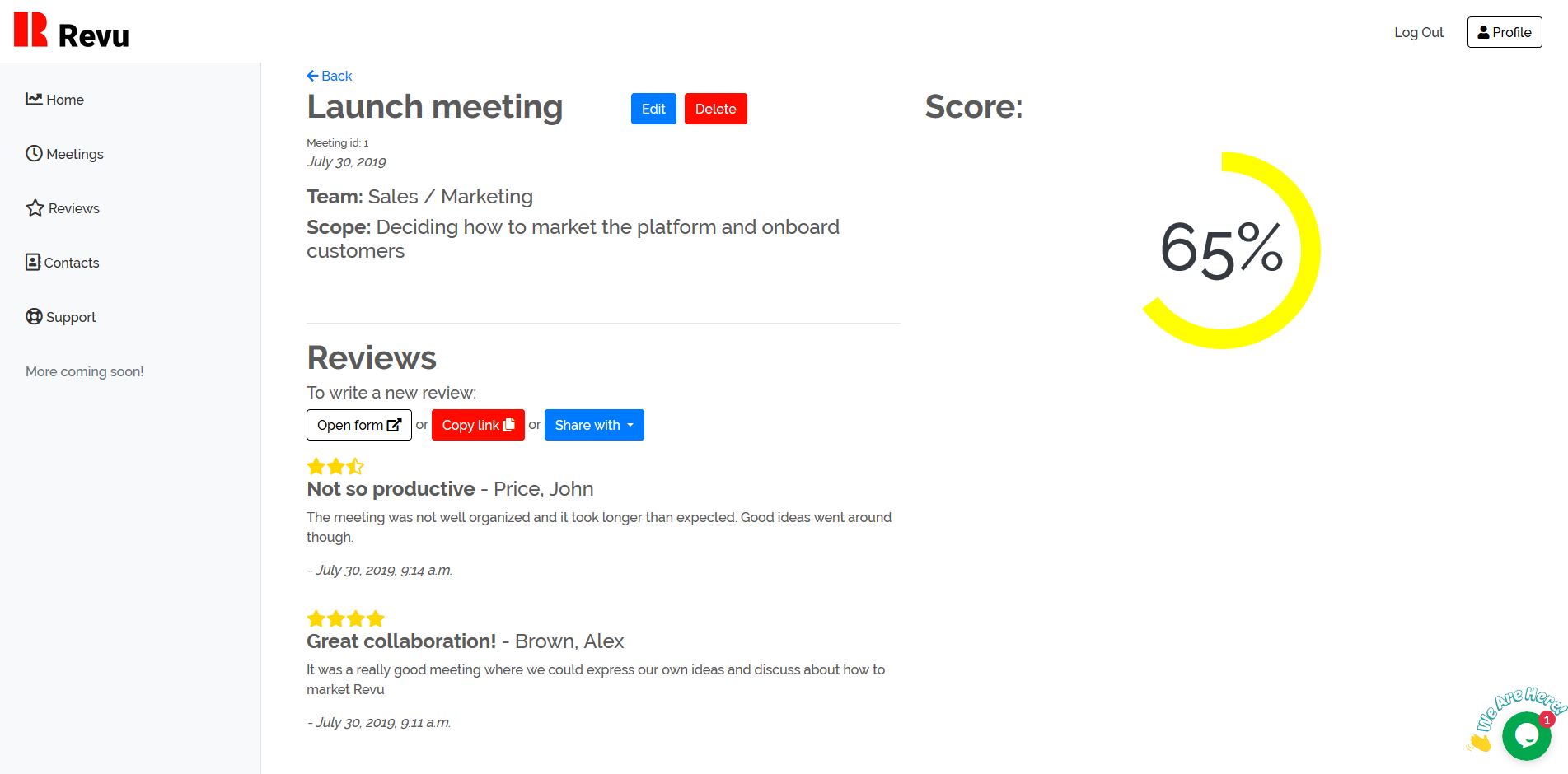 A new way of managing meetings with Revu. Plan, review and analyze your meetings all in one place. Add your meetings to Revu and each participant will be able to submit a review to give feedback on how effective a meeting was. Revu algorithmically calculates a meeting score after each meeting, giving your team a look into your meetings' success. Revu also helps you manage your contacts, employees and any person you'd want to review your meetings. Get a shortcut to remind them to review meetings, and gain better insight about their interactions with your meetings.