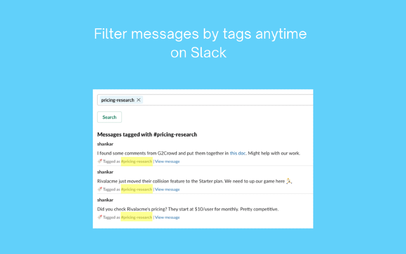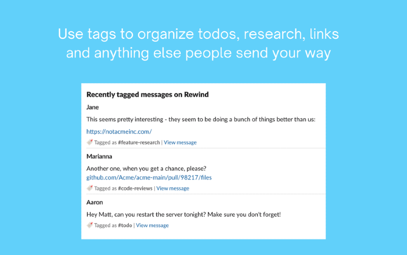 Many of us wake up to dozens of messages on Slack, feeling overwhelmed when we start our days. Rewind understands your daily Slack struggle and helps you organize and find messages faster. You can use Rewind to tag any message in your Slack workspace and find it easily later. Think of it like Slack’s saved items, but better. You can use Rewind to tag a message as ‘todo’, ‘readlater’, ‘feature-research’, ‘togetback’, pretty much anything you would like. The app is great if you have a lot going on in your Slack.
