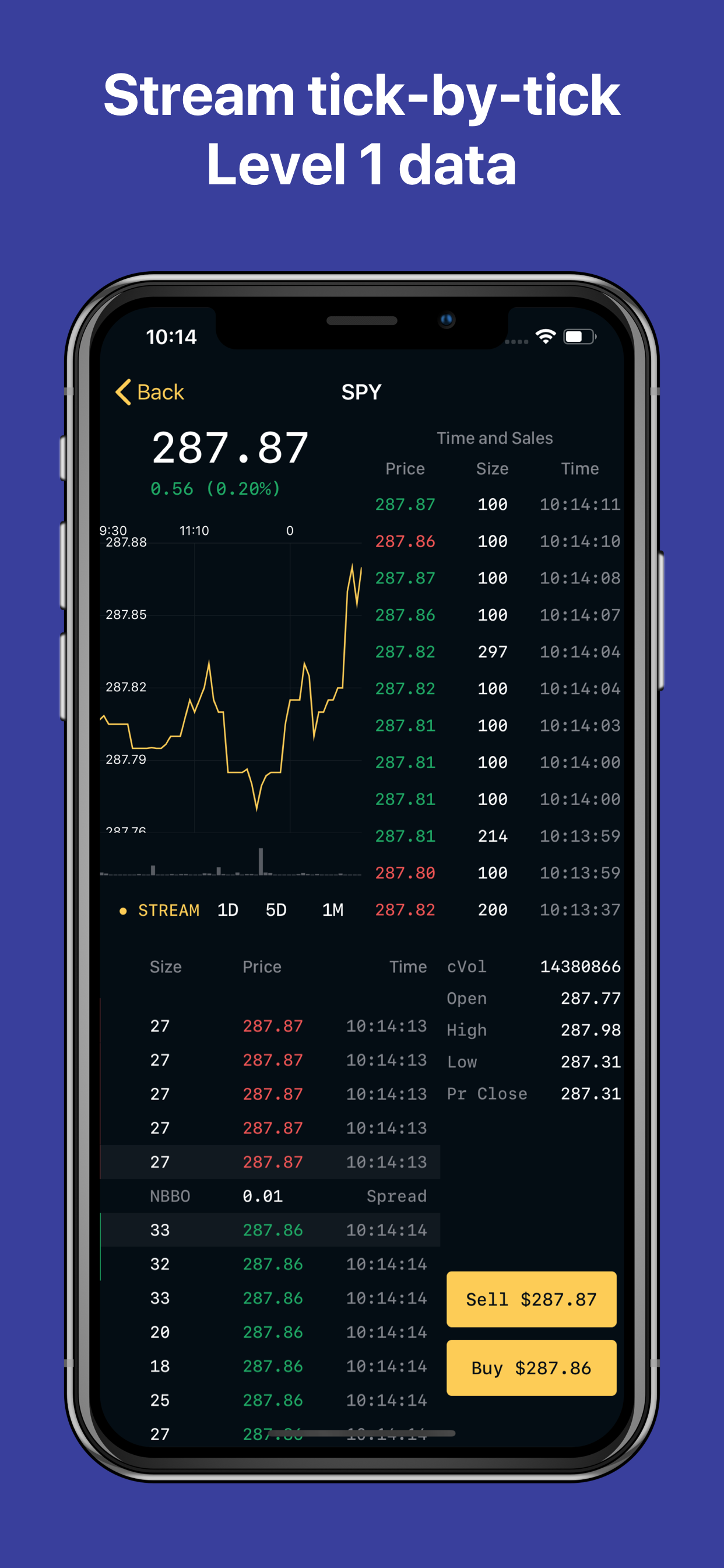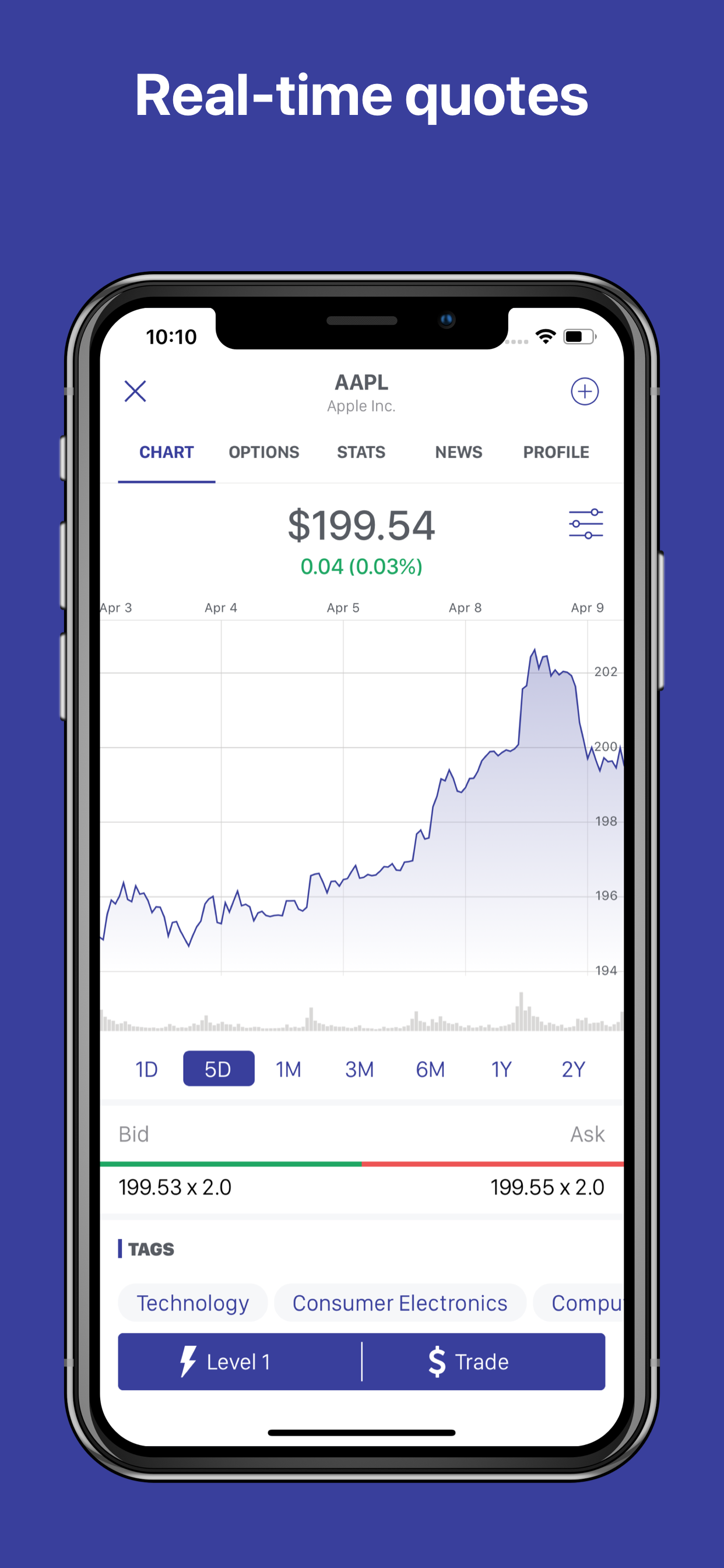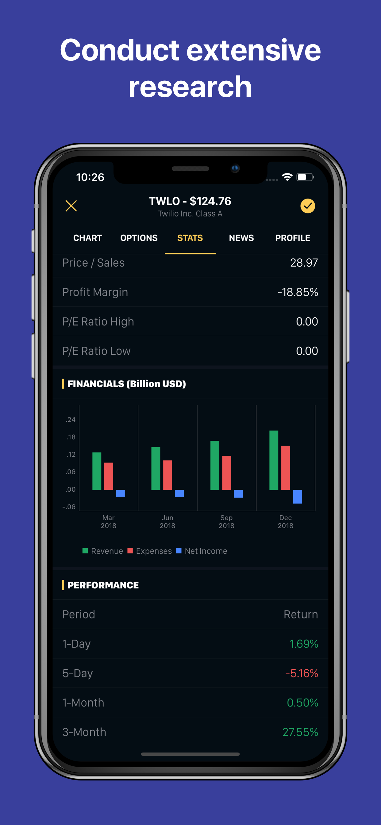 Rho lets you invest in stocks, ETFs, equity options, and index options all on the same platform. Open multiple accounts and access them on the same app. Choose between Individual, Joint, Traditional IRA, and Roth IRA accounts. Handle advanced trading strategies such as One-Cancels-the-Other (OCO) Bracket Orders with ease. Get tick-by-tick data, national best bid and offer (NBBO) quotes and up to the millisecond time and sales information sourced from 36 stocks and options exchanges. Conduct extensive research using over 100 data points provided for each stock. Dive deep into a company's earnings, financials, ownership, and many more.