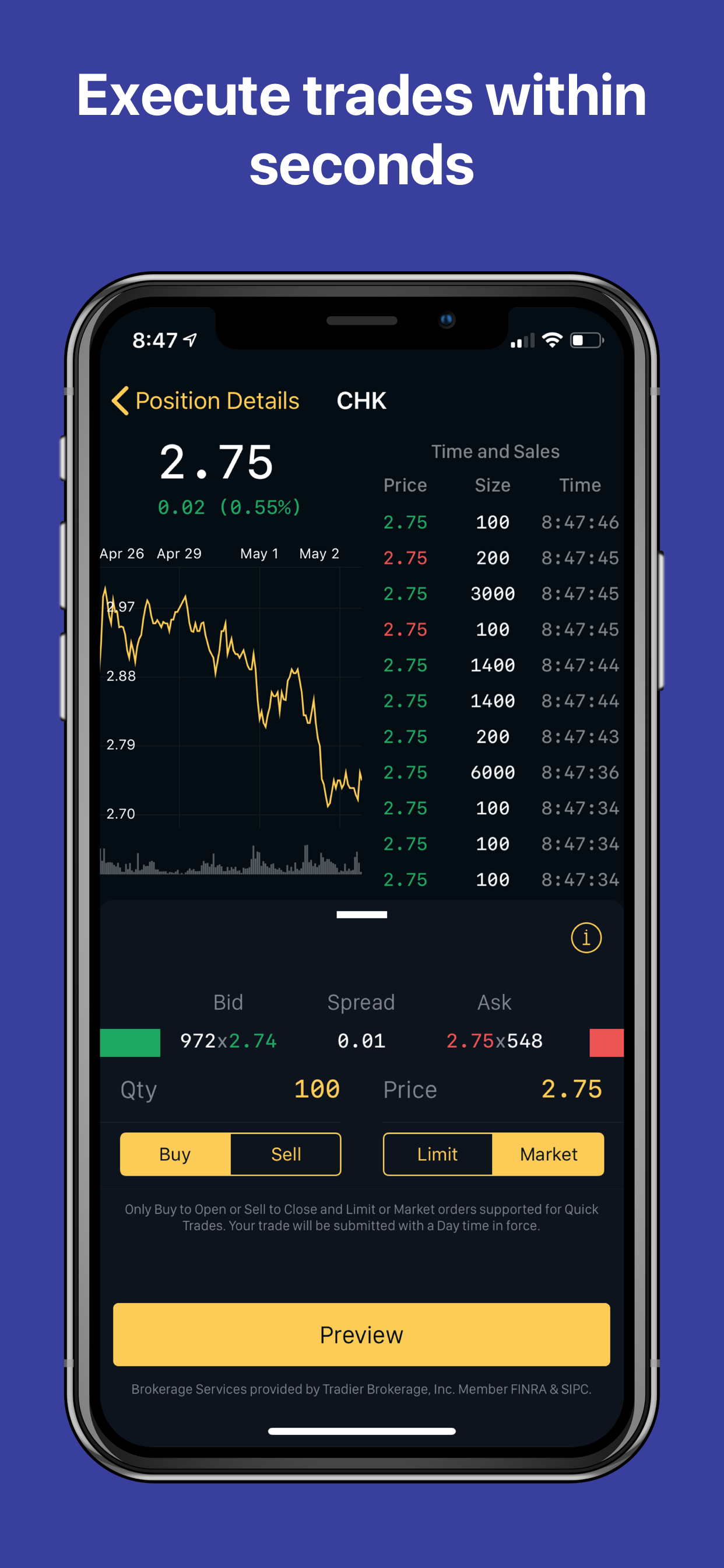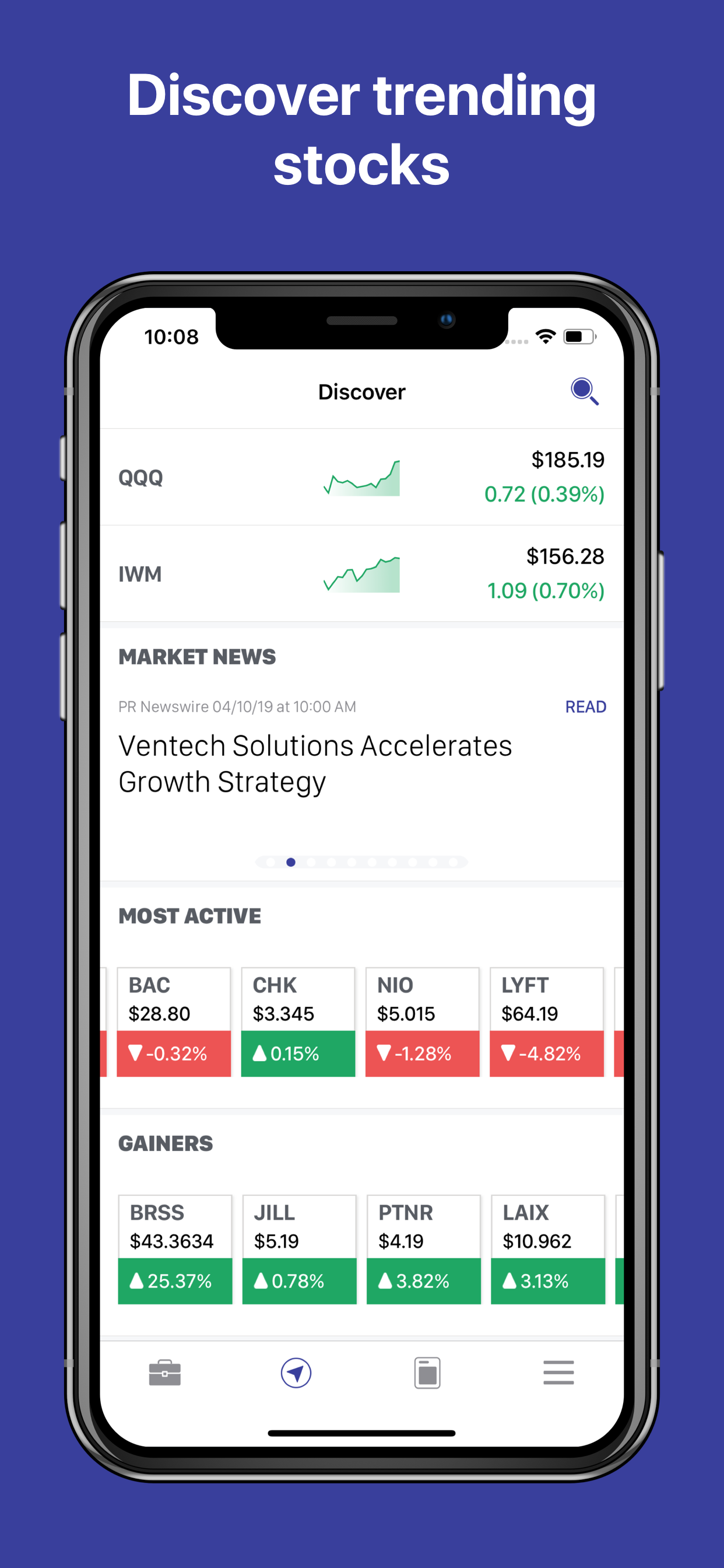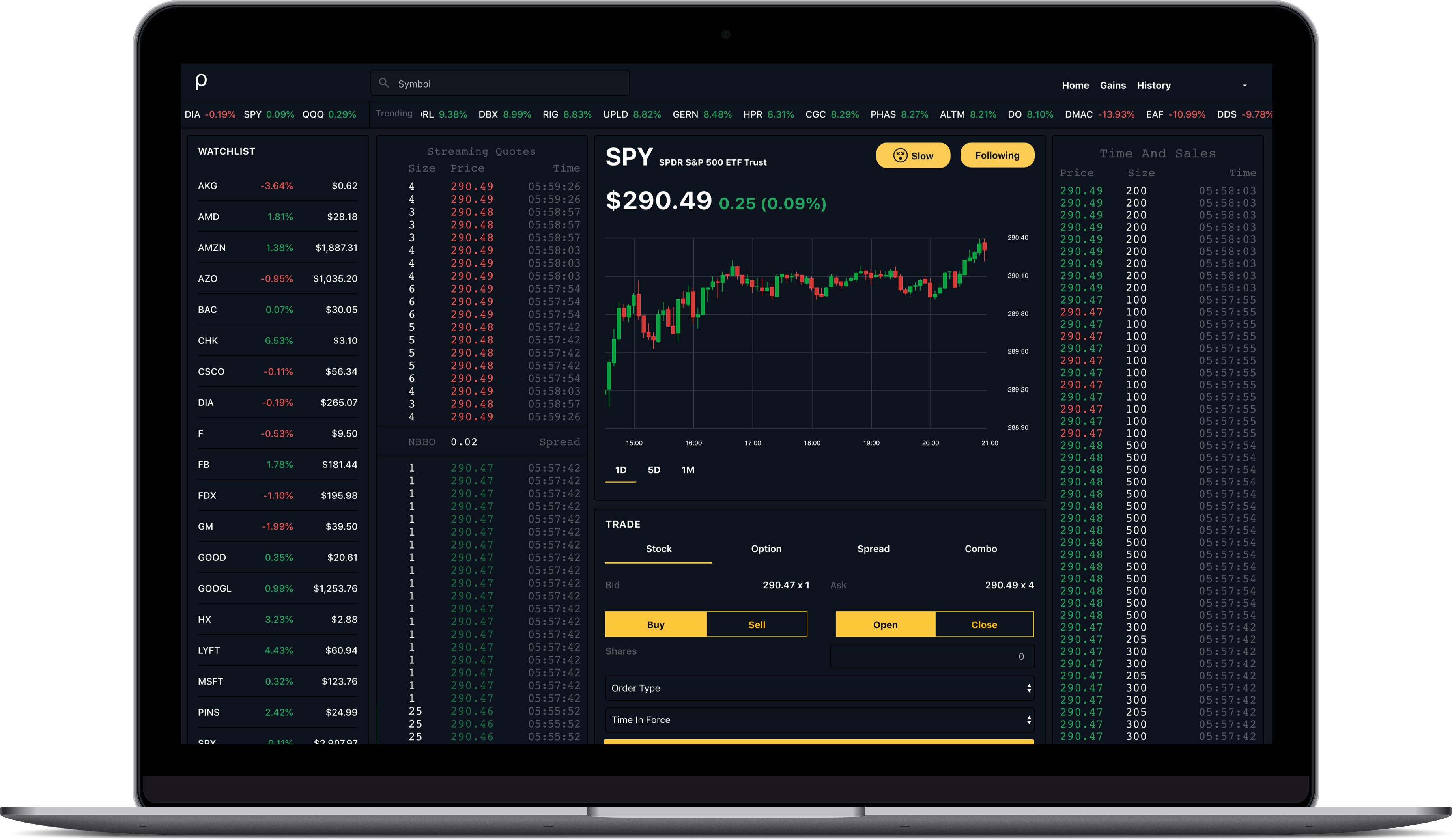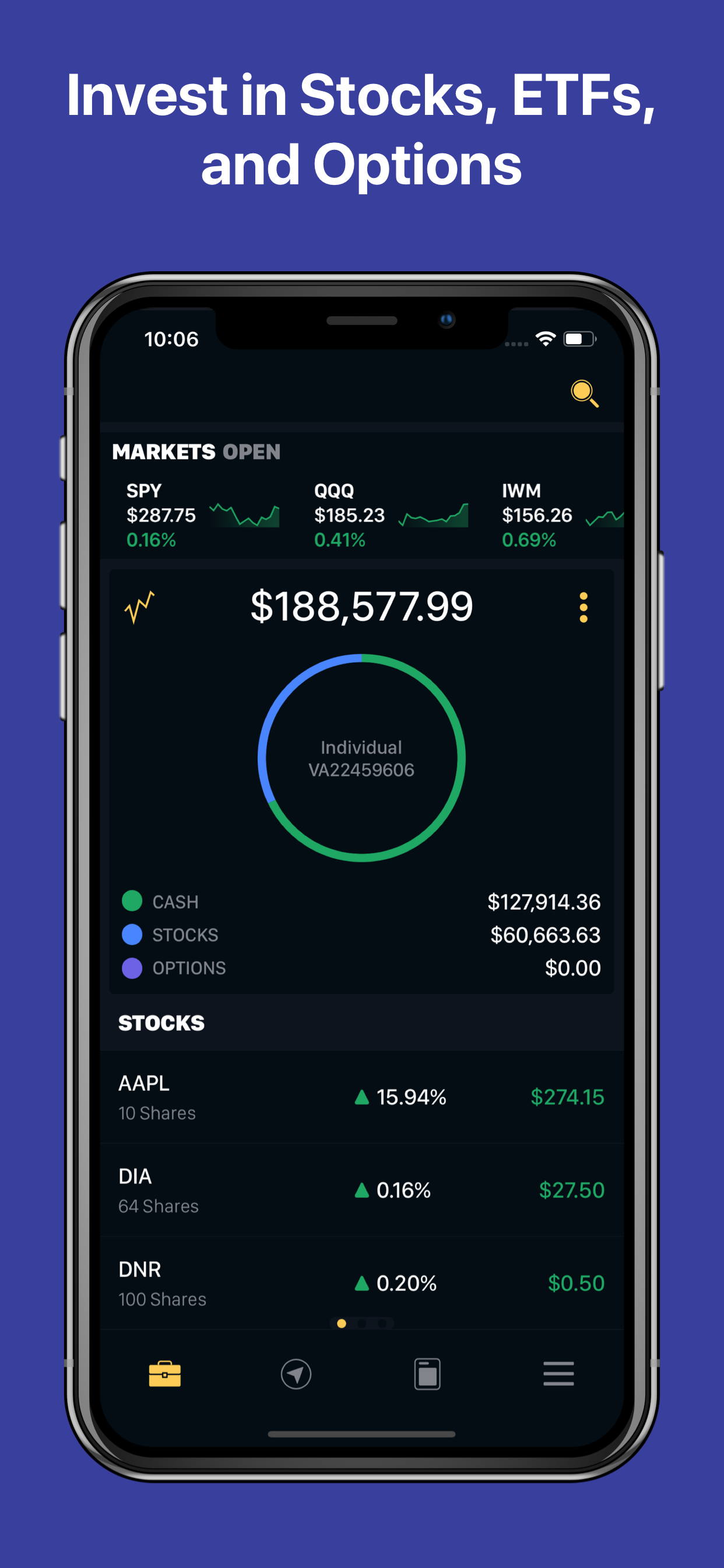 Rho lets you invest in stocks, ETFs, equity options, and index options all on the same platform. Open multiple accounts and access them on the same app. Choose between Individual, Joint, Traditional IRA, and Roth IRA accounts. Handle advanced trading strategies such as One-Cancels-the-Other (OCO) Bracket Orders with ease. Get tick-by-tick data, national best bid and offer (NBBO) quotes and up to the millisecond time and sales information sourced from 36 stocks and options exchanges. Conduct extensive research using over 100 data points provided for each stock. Dive deep into a company's earnings, financials, ownership, and many more.