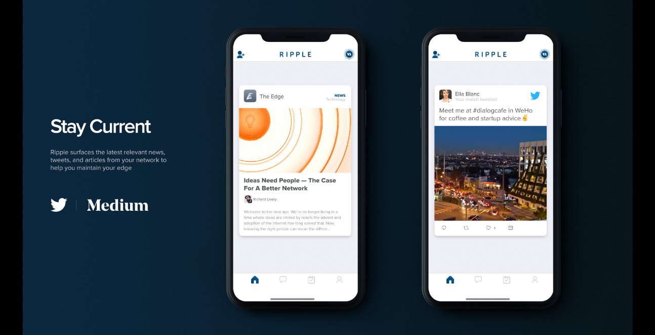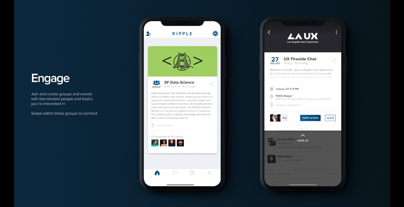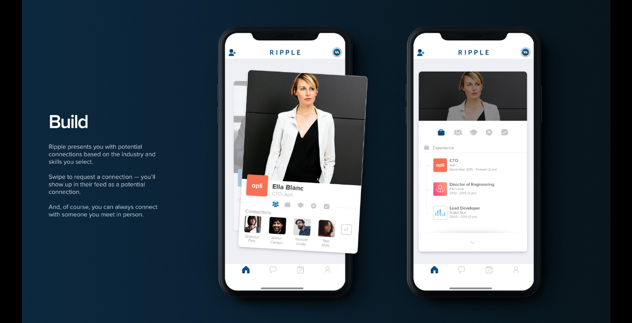 Ripple is professional networking, solved. Swipe through potential connections to grow and strengthen your network. No need to carry (or forget) business cards around; connect with people you meet using the Nearby feature. Join groups and track events to bolster your professional life, and stay on top of your game through getting the latest news - catered to your field and interests.