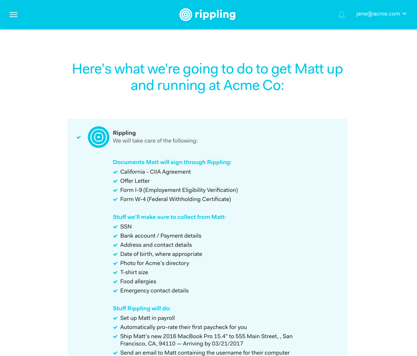 Rippling automatically does the 100 little things that IT, HR, Facilities, Legal, Finance, and employees have to do when joining, working at, or leaving a company. From buying a computer to running payroll.