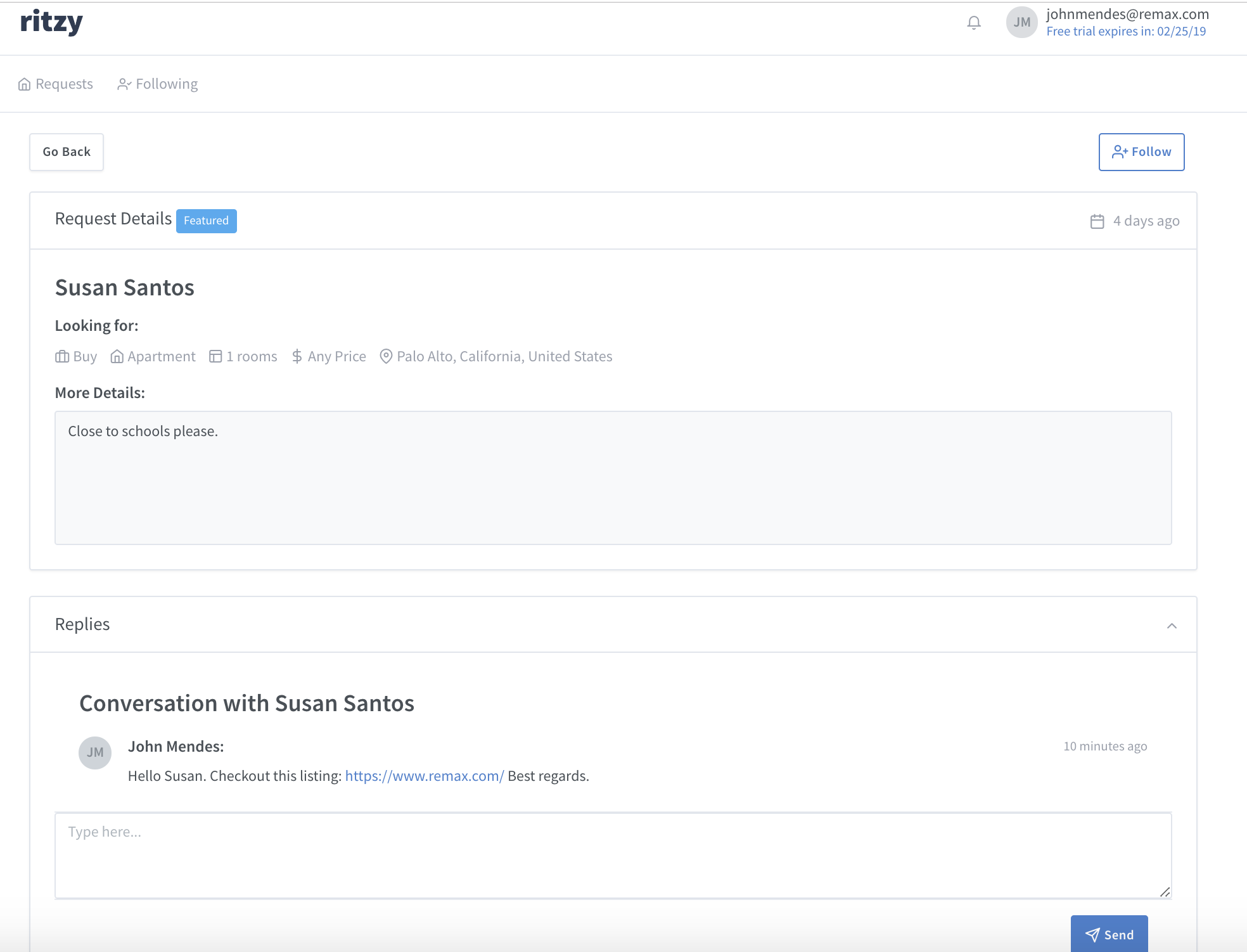 Ritzy is trying to change the way people find their next home, apartment... Instead of searching dozens of real estate websites, people submit their requests on ritzy and real estate agents and other professionals respond to requests with their listings.