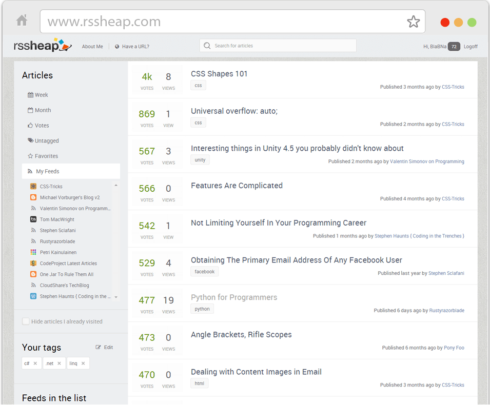 An advanced web and mobile based RSS reader for software developers. Subscribe to tags you are interested in (c#,java,ruby,...) and read high quality content