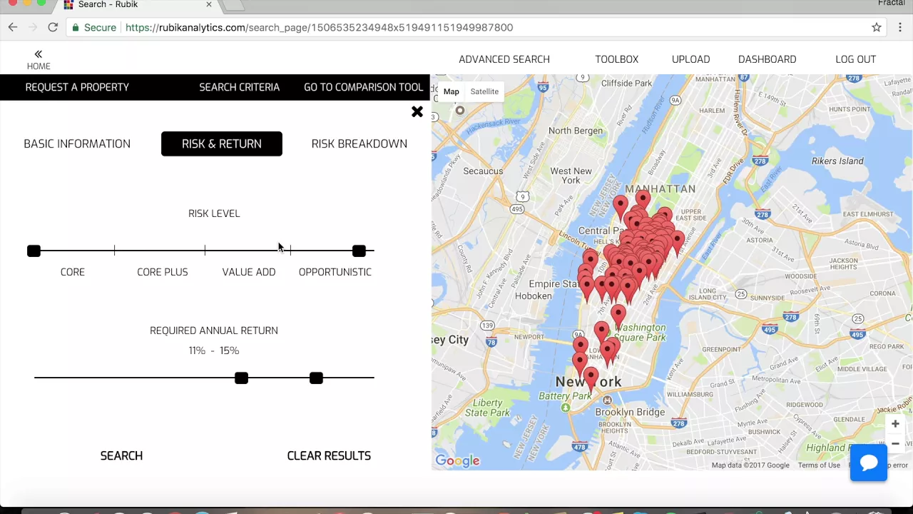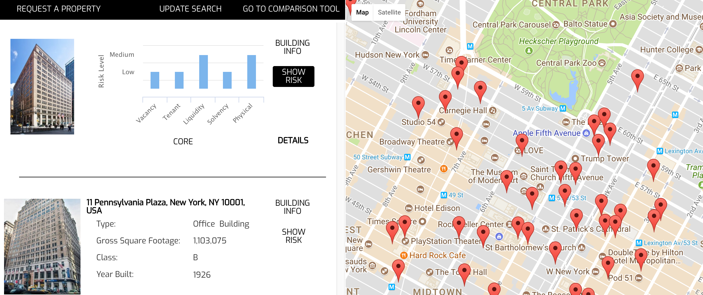 Rubik is a search engine for commercial real estate properties. Commercial real estate investors can search for properties according to the risk category they belong to. Properties belong in one of the four risk categories: Core, Core Plus, Value Add and Opportunistic. Using machine learning algorithms and financial modeling, Rubik places properties in one of the aforementioned risk categories by considering metrics that range from the volatility of rental income to historical neighborhood vacancy rates. We then quantify the total risk and price it via the required return on the potential property investment.