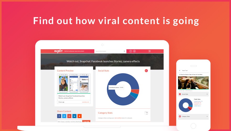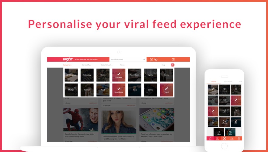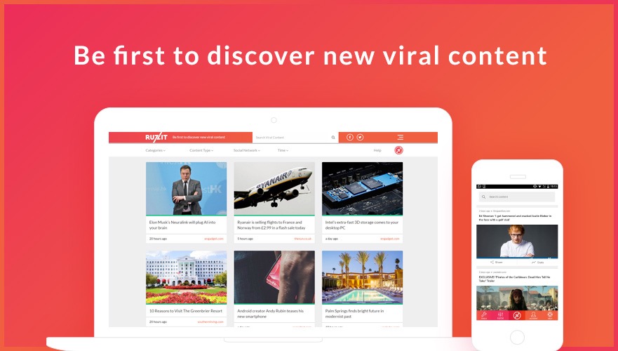 Be first to discover new viral content with the Ruzzit App! Ruzzit finds the most viral stories on the web and categorises them into a single feed. Your feed can be personalised by selecting categories you’re interested in. You can also find out stats behind each content, such as how many shares the content has - all with a single tap!
