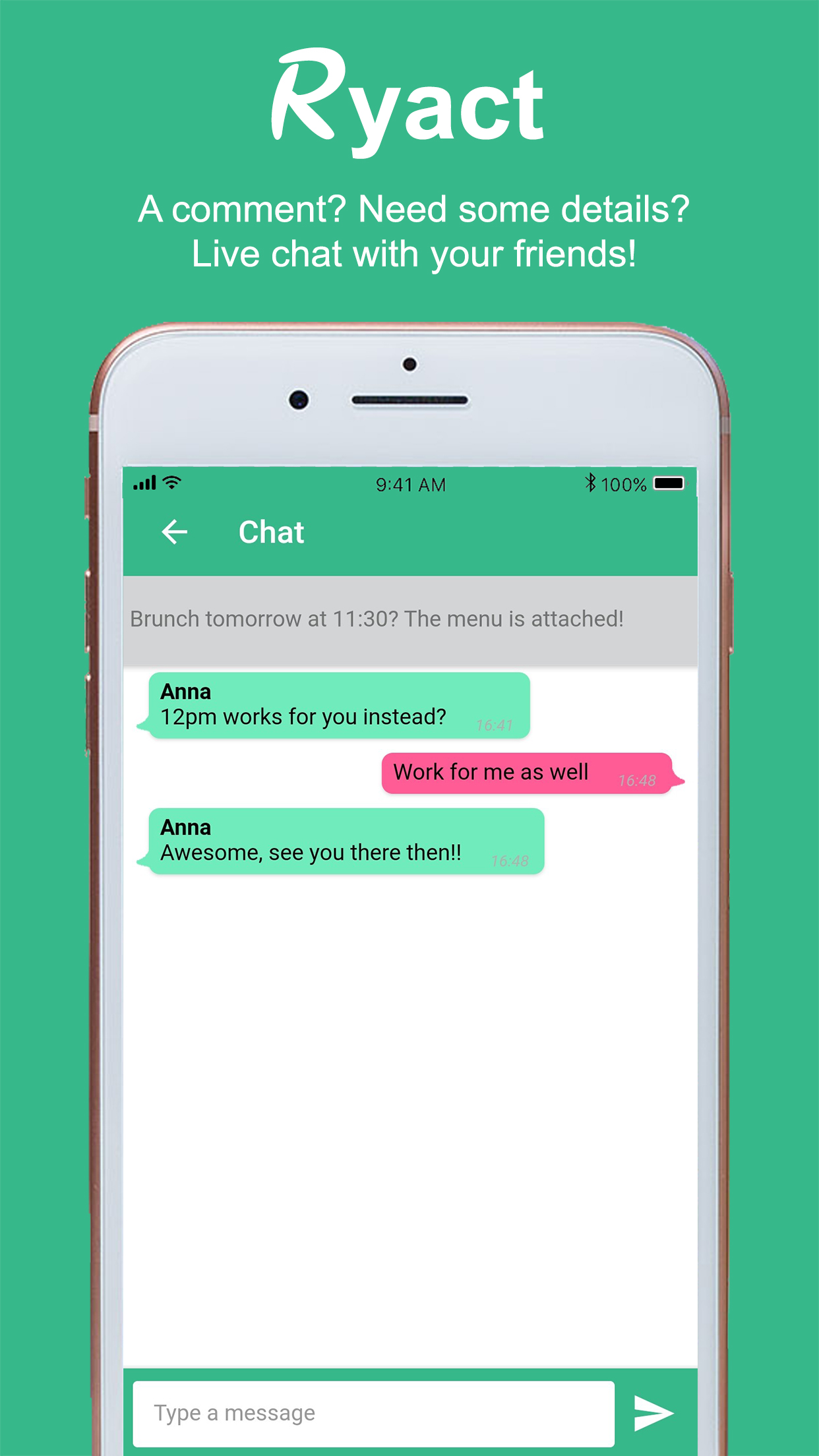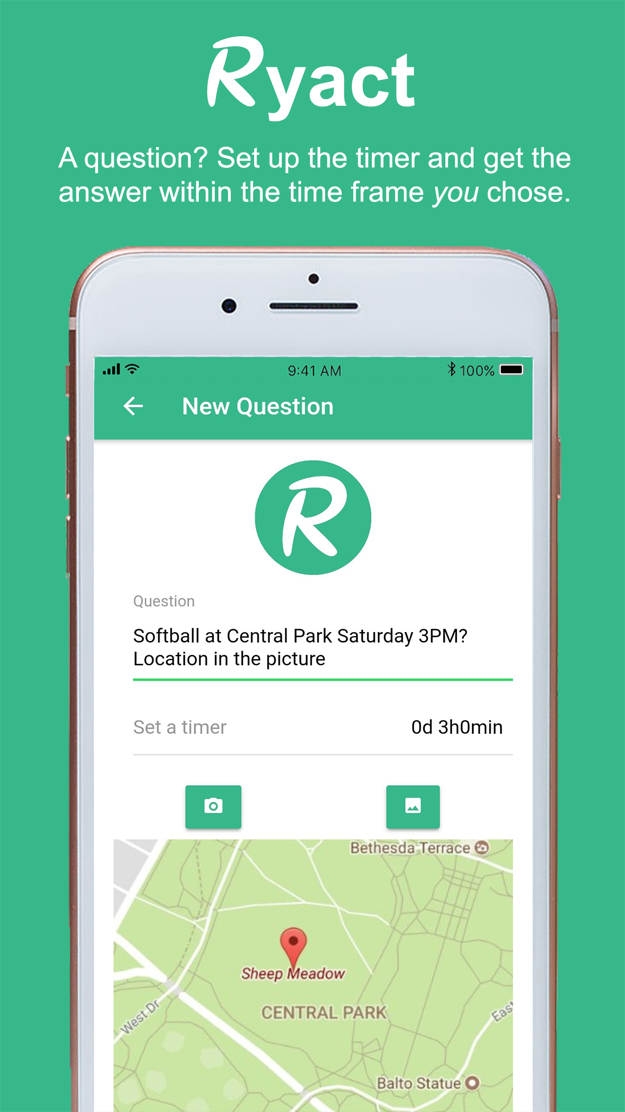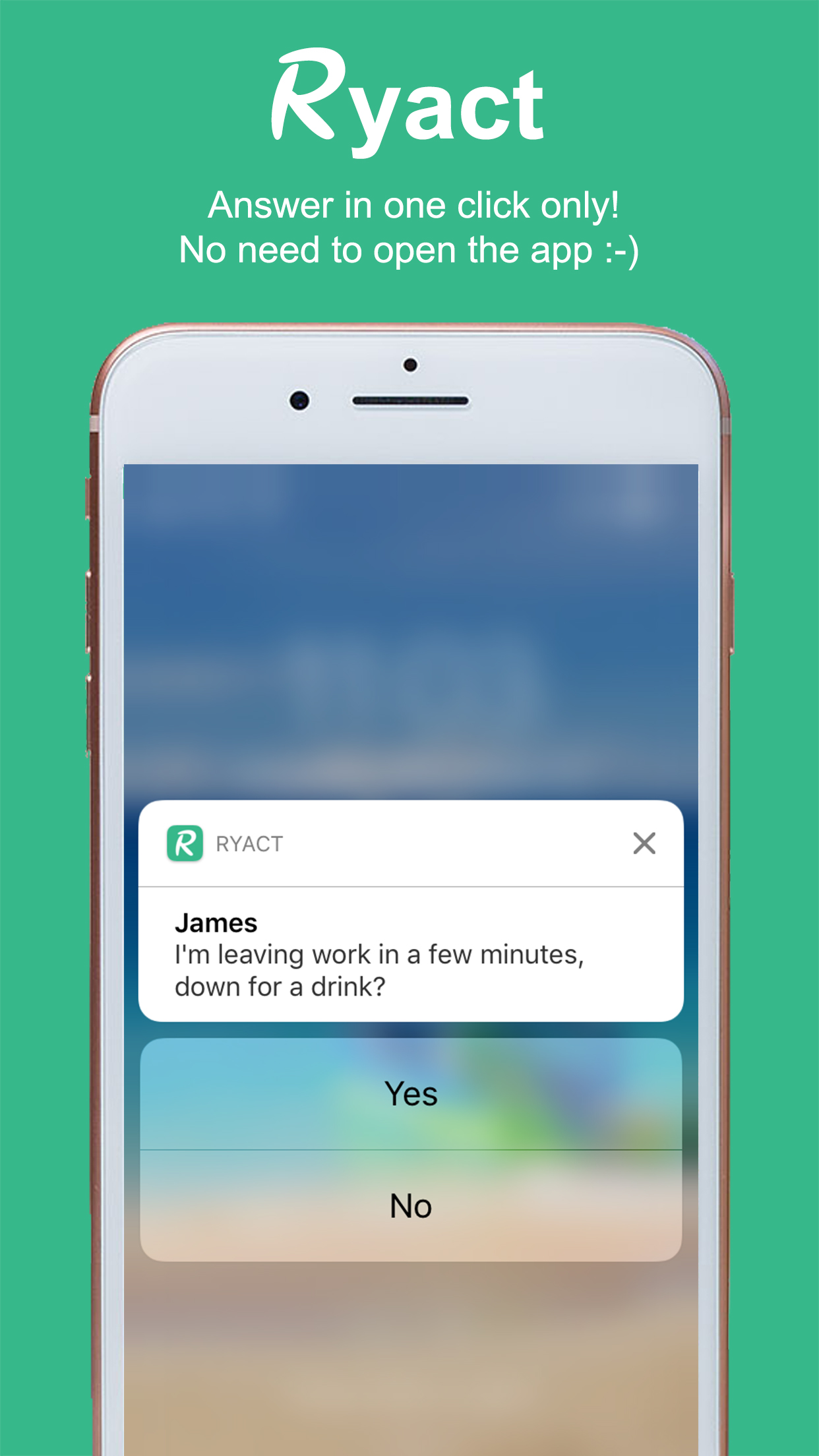 Ryact is aimed at getting your friends to answer you. Your questions are lost in the messaging apps' trails and you never obtain a timely answer? With its timer and only two answers, Yes or No, you will get your answers! You can reply directly from the notification to be even faster! And use the dedicated question's chat if details are needed. http://get.ryactapp.com https://www.facebook.com/ryact/