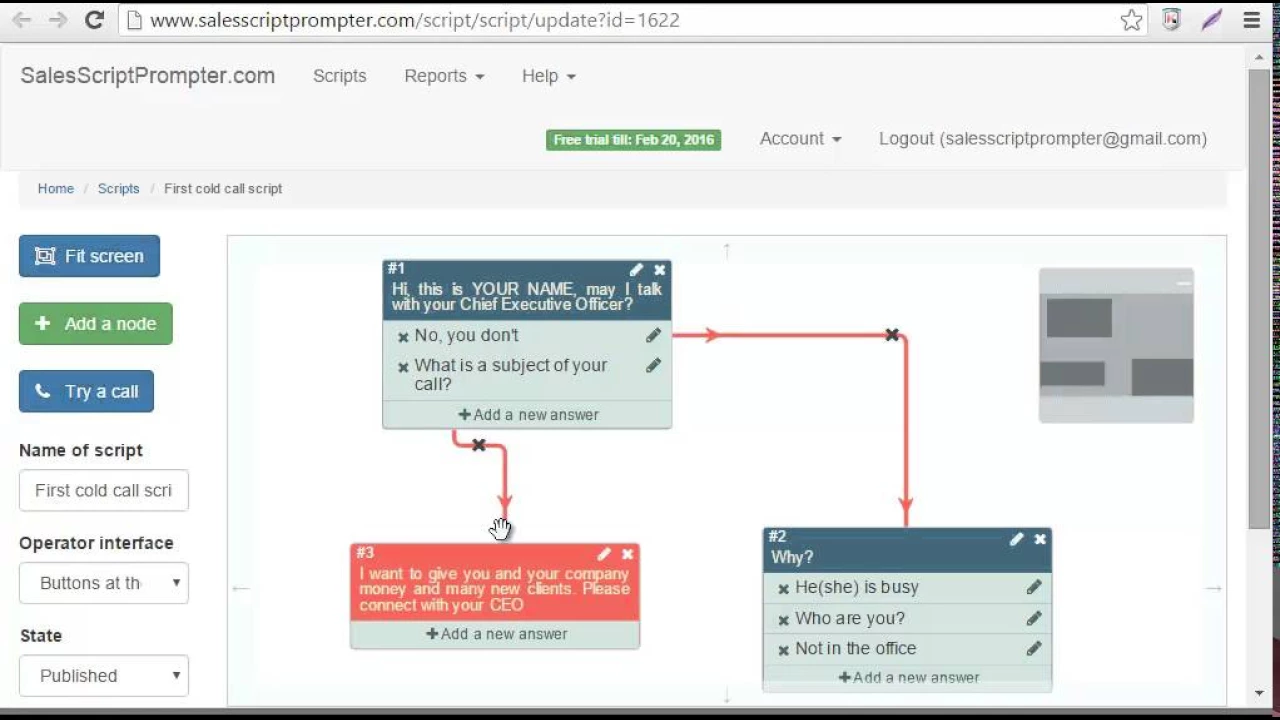 The SalesScript Prompter is a cloud service for creating, operating and evaluating scenarios and scripts for telephone calls. The SalesScript Prompter offers: 1. A comfortable visual script editor for creating required telephone call scripts quickly; 2. A script operation section (for operators) for comfortable operation of “branchy” scripts without being unfocused; 3. Reports for evaluating script efficiency and their quick adjustment; 4. Software for call recording and listening to the most important things in the telephone talks with clients. The benefits of the SalesScript Prompter are: • Easy-to-use for sales managers and operators • Fast error detection in calls and in scripts without listening • Easy to create, implement, edit and update any scripts, even the most complicated Why the Sales SalesScript Prompter? • -90% of critical errors in telephone calls • 100% of conversion growth due to the effective call scripts • 2-4 times quicker to train newcomers to the sales department • Reduction of the wages fund and staff turnover expenses by 30% • Error detection in calls within 5-10 seconds of listening The SalesScript Prompter is designed for many companies. But most often it is used by salesmen, call center operators and companies contacting their clients on the phone or via mail.