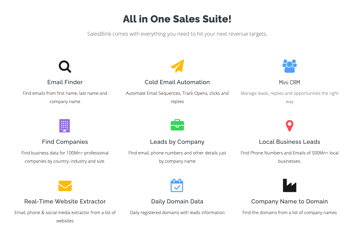 Connect with anyone using SalesBlink, a full-stack cold sales outreach platform with solutions including Unlimited Email Leads, Automated Cold Email Sequences and more! Our Lead Generation solutions are: Social Media Email Extractor - Extract emails of 1st, 2nd, and 3rd connections from Social Media along with their Job Title, company details, and more. Email Finder - Find Anyone’s email address by their name and company website. B2B Website Data Enrichment- Enrich company employee data with the just website address, extract employee email address, name, B2B Database - Find target company data from our B2B database. Our database contains 100Mn+ B2B company details across 200 countries and 130+ industries. Daily Domain Leads - Get ‘Who Is’ data of domains that are registered every day. This data includes emails, phone numbers, etc. of the owners of the domain. Our Outreach solutions are: Social Media Outreach - Automate Social Media Connection requests with custom messages at scale Cold Email Sequences - Automate Cold Email Sequences with multiple follow-ups, land in your customer’s inbox every time. Track opens, clicks, replies, bounces. Mass Email Outreach - Send Mass email to your email lists, track clicks, and opens.