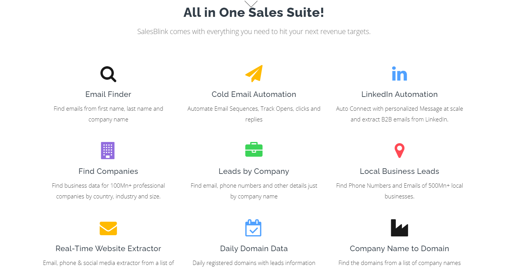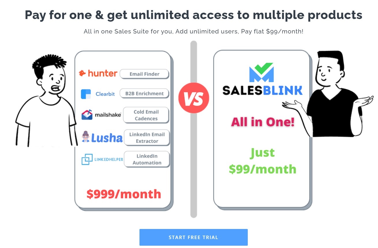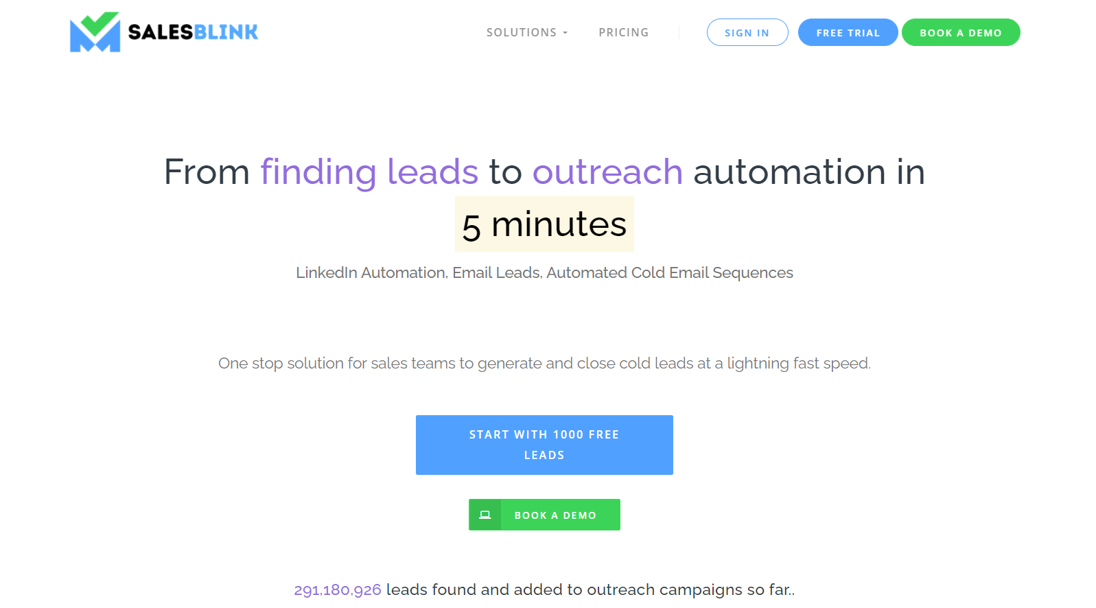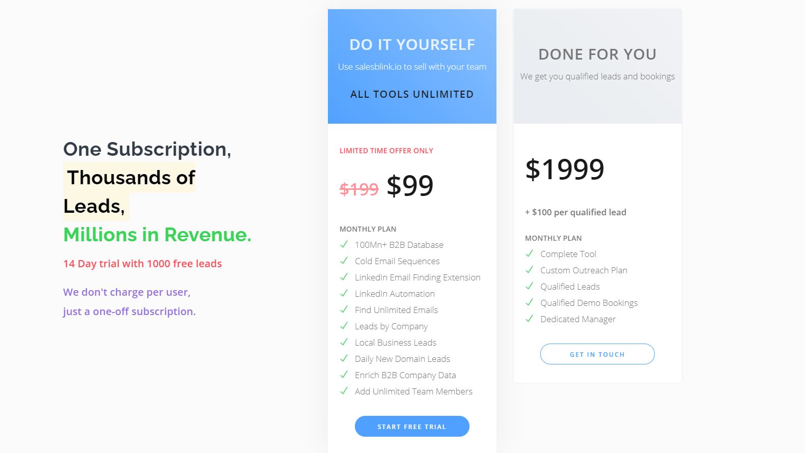 SalesBlink is an all in one full stack cold outreach platform. From Lead Generation to Outreach, Everything Unlimited, All in simple subscription of $99 (Limited period offer). Lead Generation solutions Include: Linkedin Email Extractor, Email Finder, B2B Website Data Enrichment, B2B Database, Daily Domain Leads. Outreach solutions Include: LinkedIn Outreach, Cold Email Sequences, Mass Email Outreach. Start your 7-day free trial and let me know what you think in the comments! :)