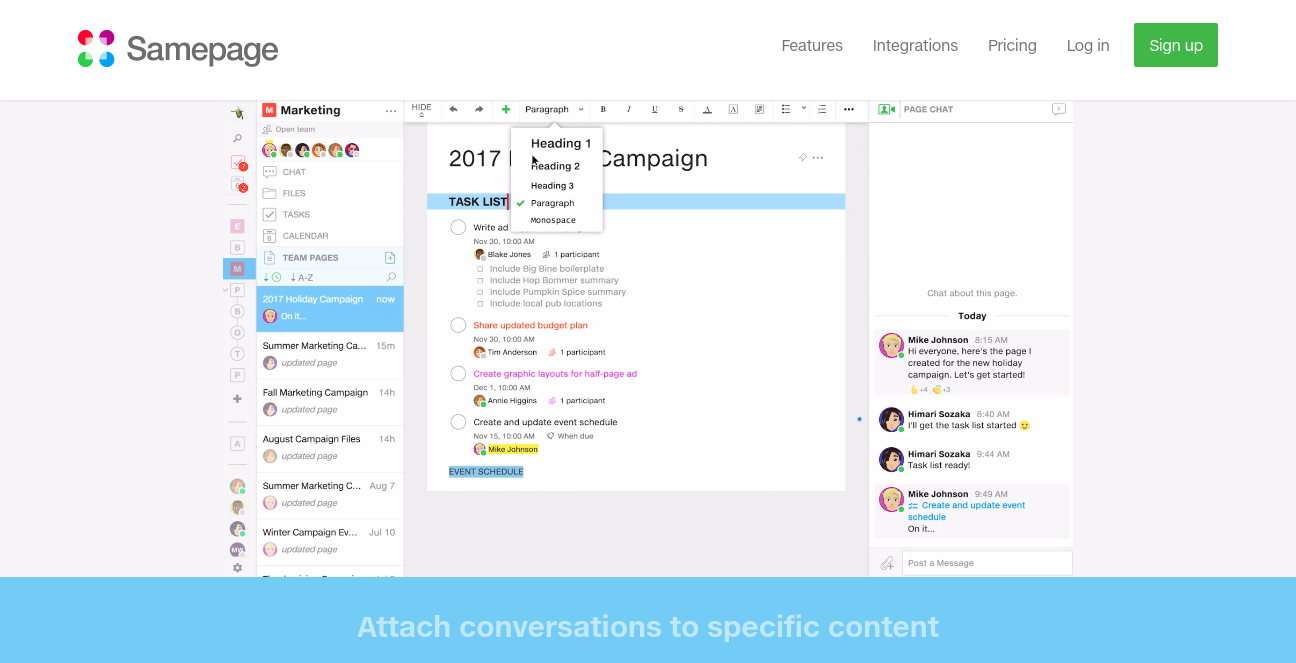 COLLABORATION SOFTWARE IS ALL ABOUT PRODUCTIVITY There are few things less productive than hopping between a bunch of different apps when working with your team on a project. Samepage helps you avoid that by bringing your team together with a full suite of real-time collaboration tools, all in one place. Plus, it's actually fun to use. REAL-TIME COLLABORATIVE EDITING Simultaneous and version-controlled editing of the same document by multiple members of your team - that's what you'll find here. But this is no normal document. It's a living page capable of handling tasks, files, videos, diagrams - you name it. Plus, each page you create keeps track of your team's group chats and video calls, so any newcomer is up to speed almost instantly. You'll know your next project is running smoothly when your whole team is saying "We are all on the same page."™ -Manage projects, tasks & calendars -Share & edit files with ease -Chat with the team from anywhere