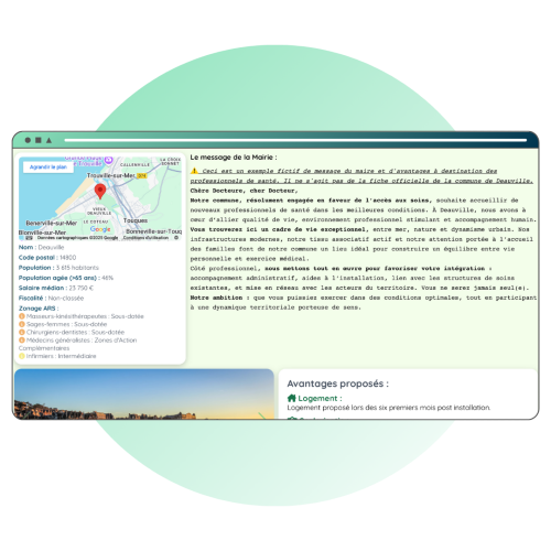 Santeris offers a map with filters to help any general practitioner, dentist, nurse, midwife, or physiotherapist find the ideal area in which to set up or open a practice. Santeris then connects the healthcare professional with the municipality or group of municipalities, supports them in applying for financial aid and grants, and assists them all the way through to their actual installation.
