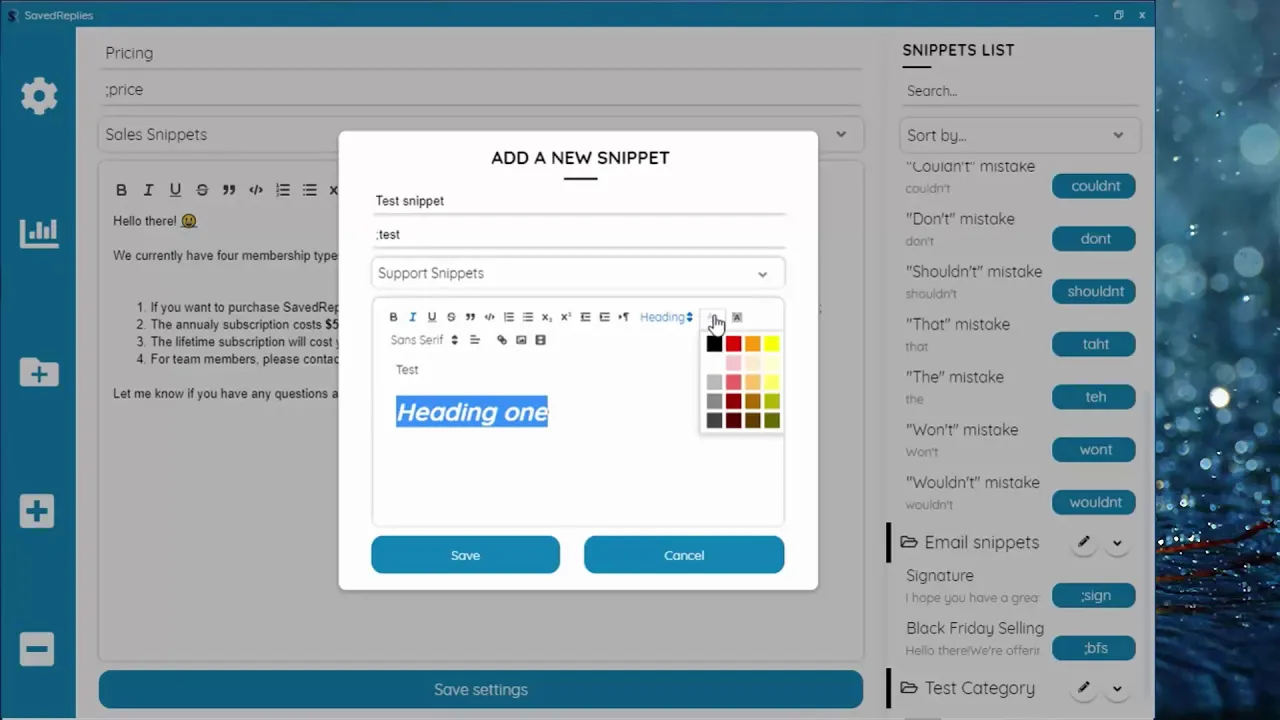 What are Saved Replies Saved Replies are pre-crafted responses that you create around your frequently asked questions. Using Saved Replies can reduce response times by saving yourself from typing out the same answers over and over again. Typical examples might include your pricing information, refund policy, and answers to complex questions.