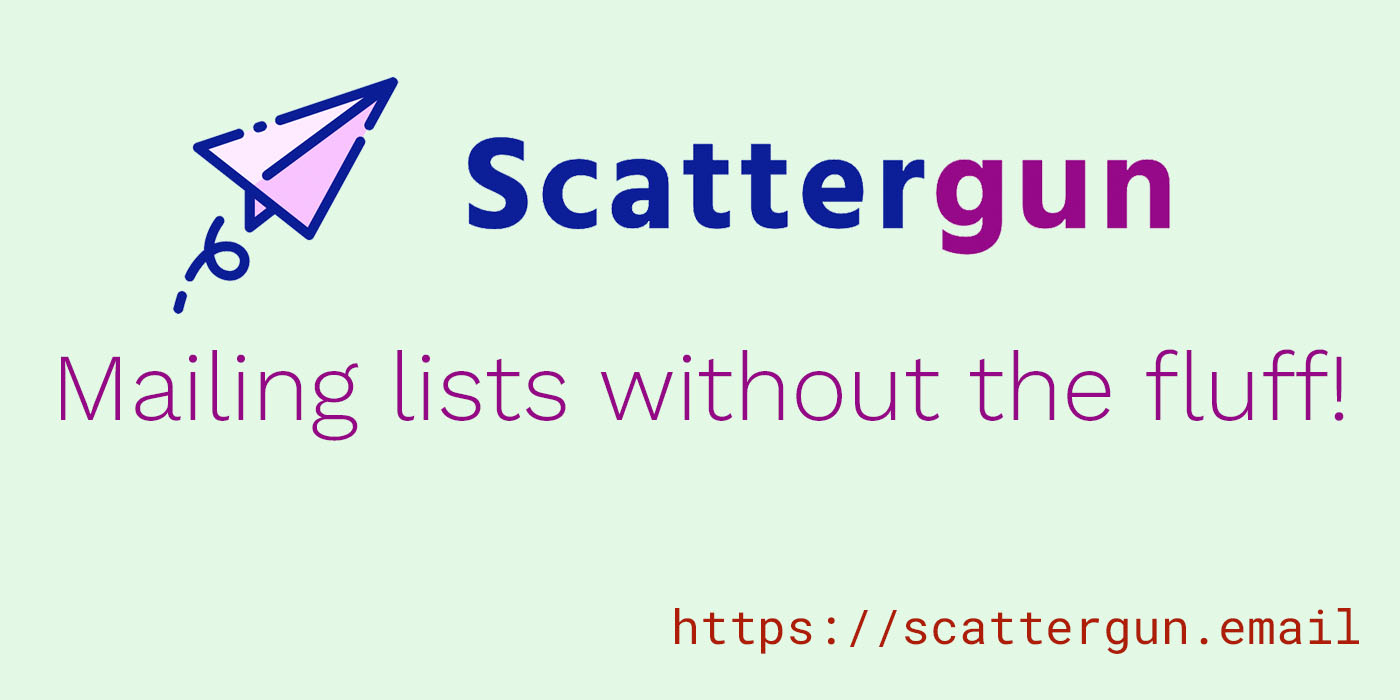 Scattergun is a privacy and simplicity focused mailing list app. You can embed a subscription form on your landing page with just a couple of lines of code; and then email that list by sending an email to an alias that Scattergun provides. That's it. No bells, no whistles. Just email as it should be.