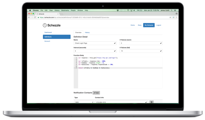 Schezzle was founded with a simple mission, to add flexibility and ease to automated API monitoring and testing. Using Schezzle's definition framework, users define simple or complex definitions that can test for response codes, body, latency, and more. Check for single responses, or build out scenarios with dependencies. You write the script, so the possibilities are endless.