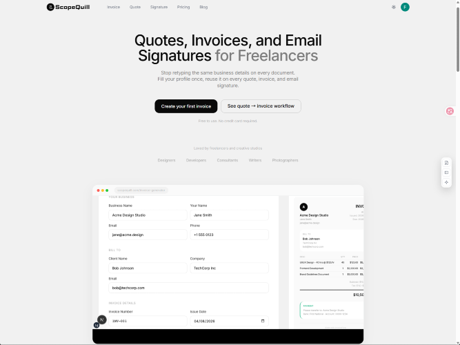 ScopeQuill is a browser-based tool for freelancers and small service businesses who need simple client document workflows. It helps users create professional quotes, invoices, estimates, and HTML email signatures from one reusable business profile, so they do not have to re-enter the same details every time. Key features: - Invoice generator - Quote generator - Estimate generator - Email signature generator - Reusable business profile - Simple browser-based workflow - No signup required ScopeQuill is designed for freelancers, consultants, designers, developers, writers, photographers, and other independent professionals who want lightweight business tools without complicated software.