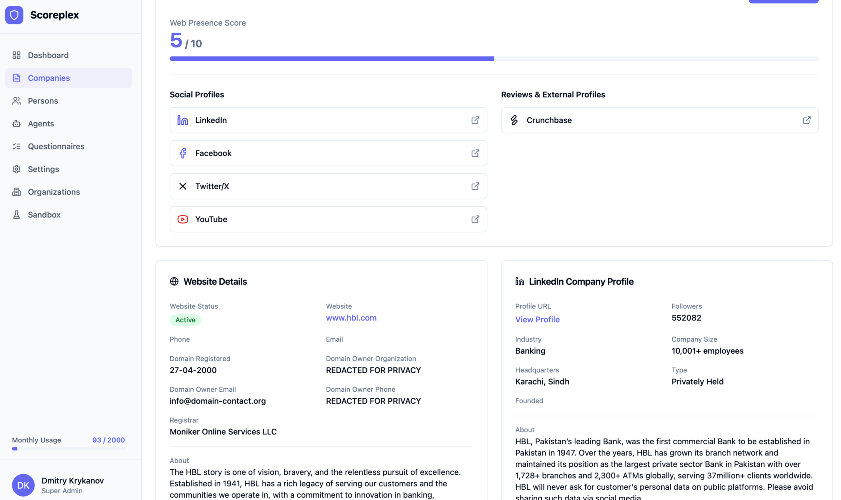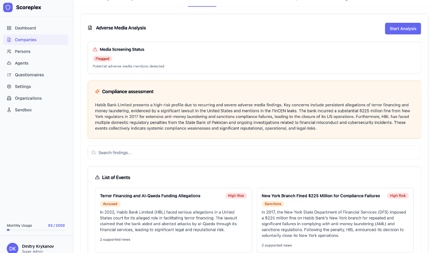 Scoreplex is a KYB AI coworker that automates end-to-end customer due diligence, minimizes false positives, streamlines document verification, and generates comprehensive evidence-linked, audit-ready narrative reports in minutes, not days. The result: same-day, audit-ready KYB - 10× less manual work, up to 10× cheaper than mainstream tools, fewer false positives, faster cross-border onboarding.